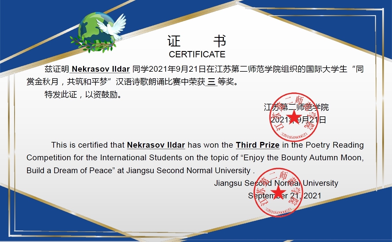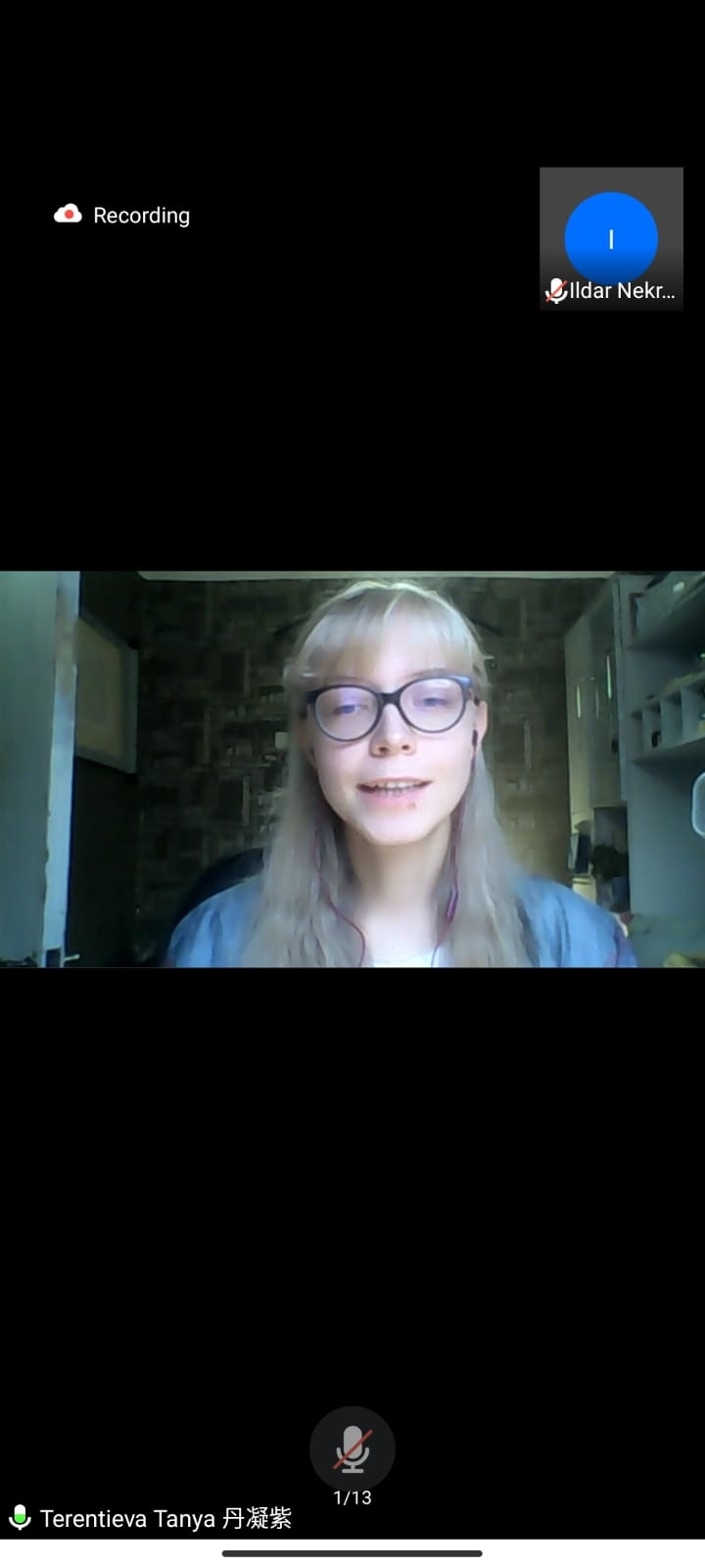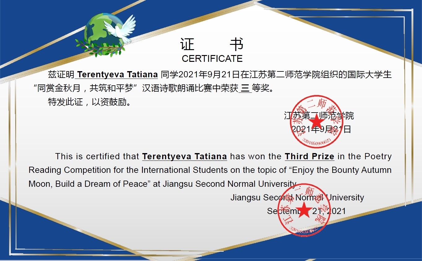 The competition was held in the online mode, and the only working language was Chinese. Among the participants, there were students from Russia, China, and Indonesia. Everybody read out Chinese poems they had chosen themselves, and one of the participants even sang a song in Chinese. In the beginning, organizers determined the order in which the participants were to declaim poems by generating a random number from 1 to 15 (I got the number 9). After that, we proceeded with the poem reciting. Incidentally, all the participants, with no exception, had prepared perfectly for the event. They recited poems so well that all the listeners could see beyond the surface (内行看门道,外行看热闹) of the poetry dedicated to the Mid-Autumn Festival (中秋节). As for me, I was on pins and needles first, but persistence and several rehearsals helped me overcome my nervousness, —精卫填海. I am sure that patience and hard work will get us to a high level of Chinese language knowledge and poem declamation (用枪刺穿侵占第一位).
