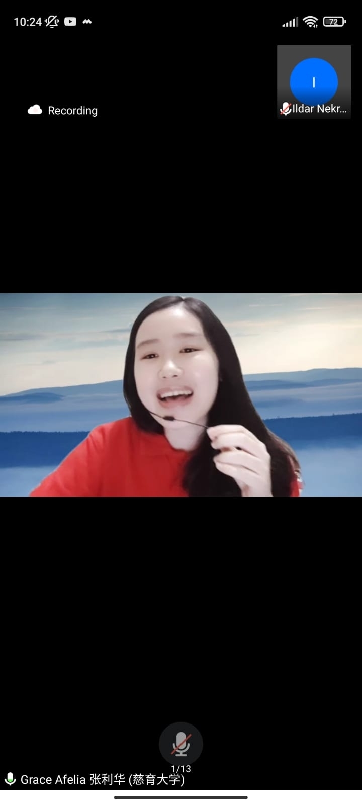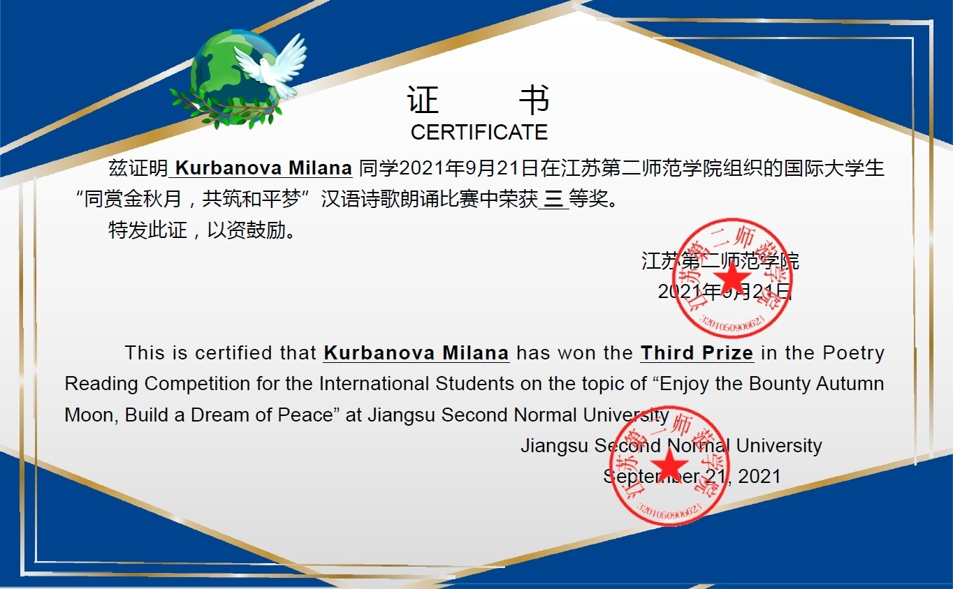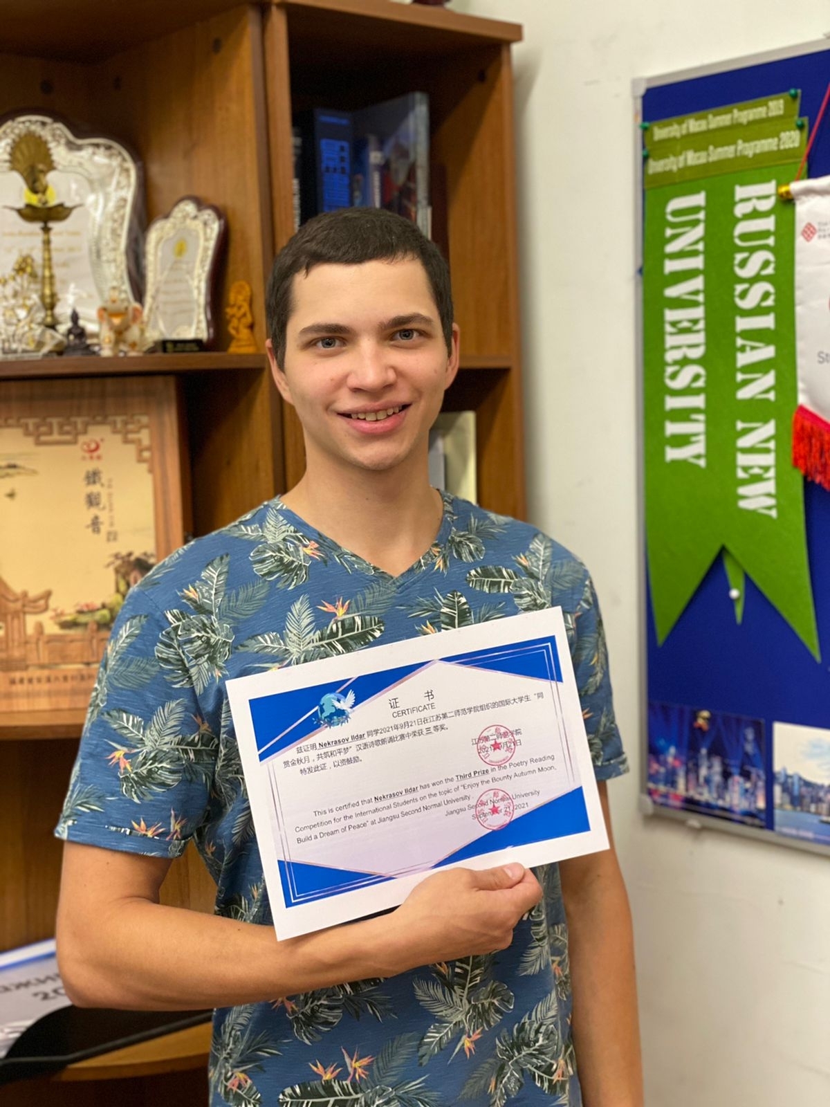 The competition was held in the online mode, and the only working language was Chinese. Among the participants, there were students from Russia, China, and Indonesia. Everybody read out Chinese poems they had chosen themselves, and one of the participants even sang a song in Chinese. In the beginning, organizers determined the order in which the participants were to declaim poems by generating a random number from 1 to 15 (I got the number 9). After that, we proceeded with the poem reciting. Incidentally, all the participants, with no exception, had prepared perfectly for the event. They recited poems so well that all the listeners could see beyond the surface (内行看门道,外行看热闹) of the poetry dedicated to the Mid-Autumn Festival (中秋节). As for me, I was on pins and needles first, but persistence and several rehearsals helped me overcome my nervousness, —精卫填海. I am sure that patience and hard work will get us to a high level of Chinese language knowledge and poem declamation (用枪刺穿侵占第一位).