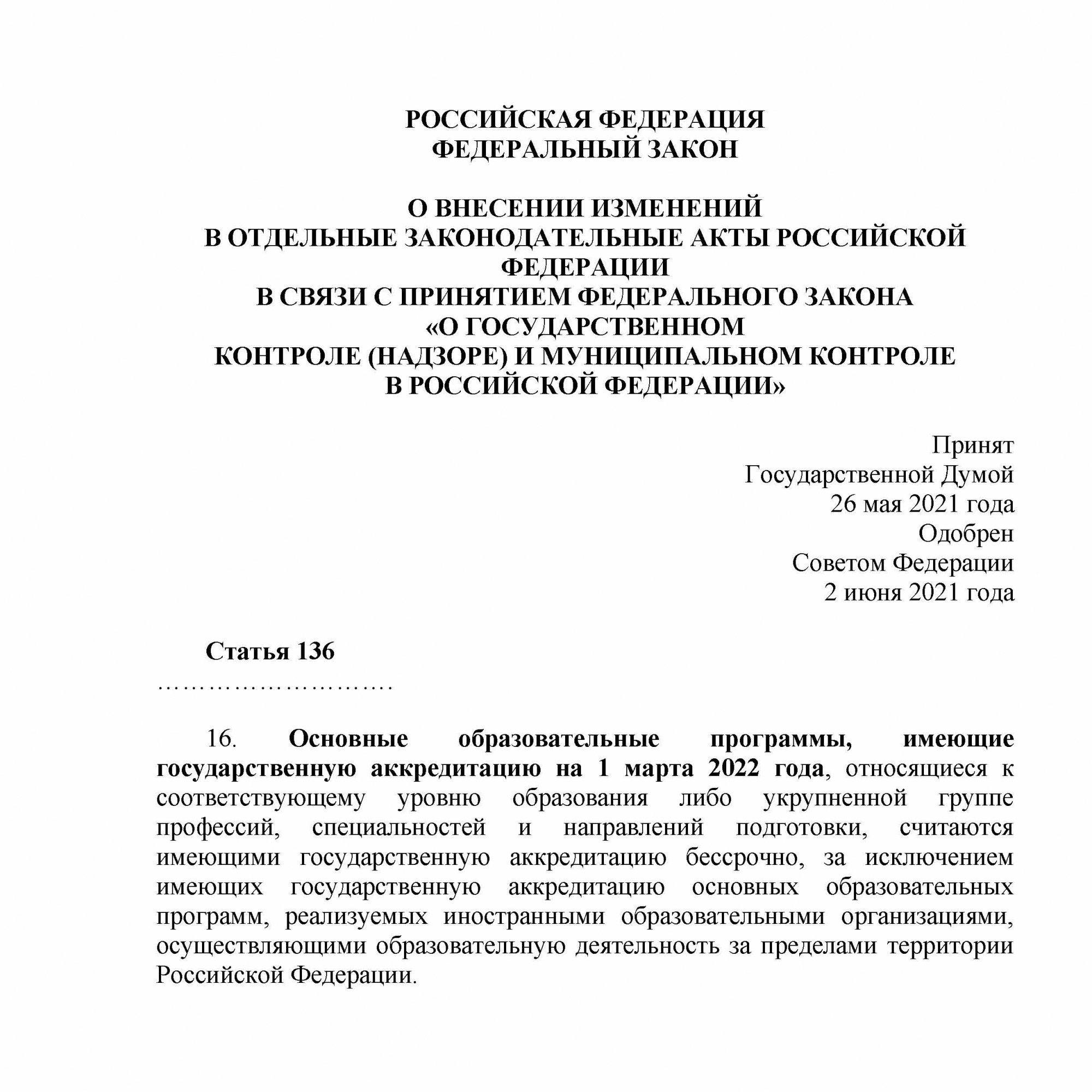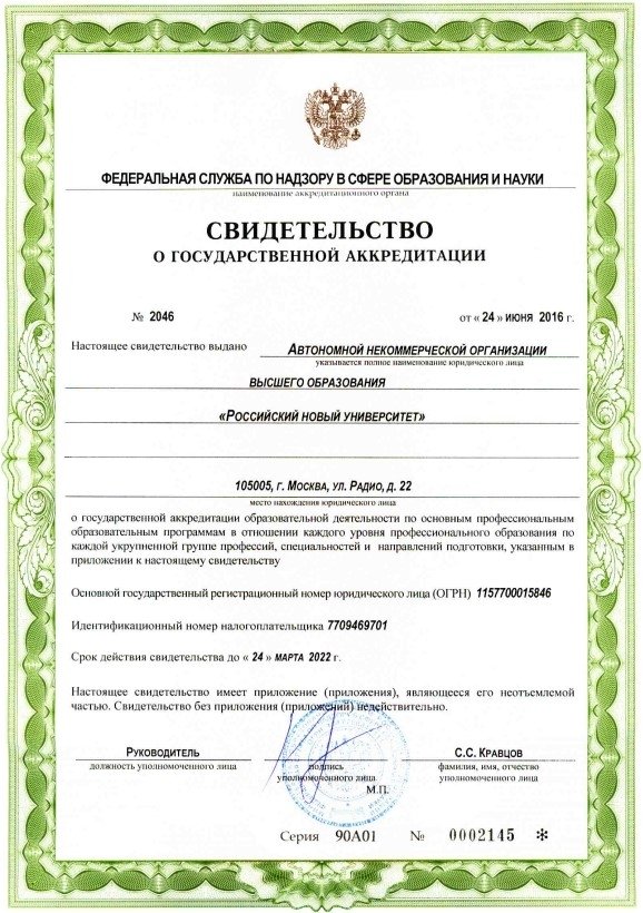 В соответствии со статьей 136 Федерального Закона Российской Федерации от 11.06.2021 № 170-ФЗ «О внесении изменений в отдельные законодательные акты Российской Федерации в связи с принятием федерального закона «О государственном контроле (надзоре) и муниципальном контроле в Российской Федерации» с 01 марта 2022 года государственная аккредитация АНО ВО «Российский новый университет» стала бессрочной.