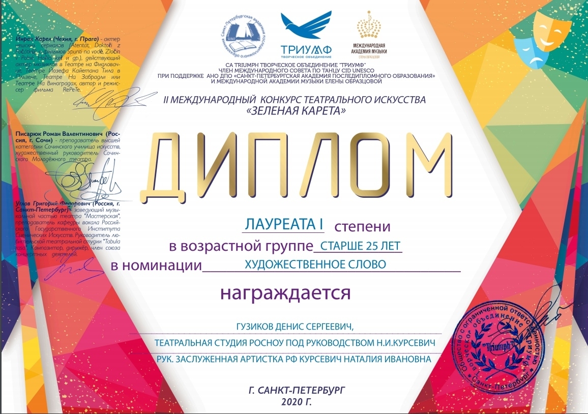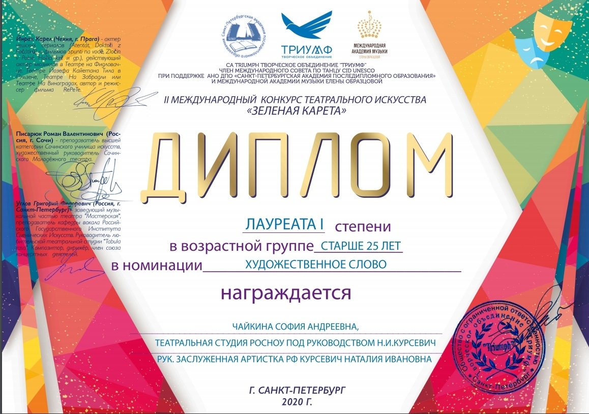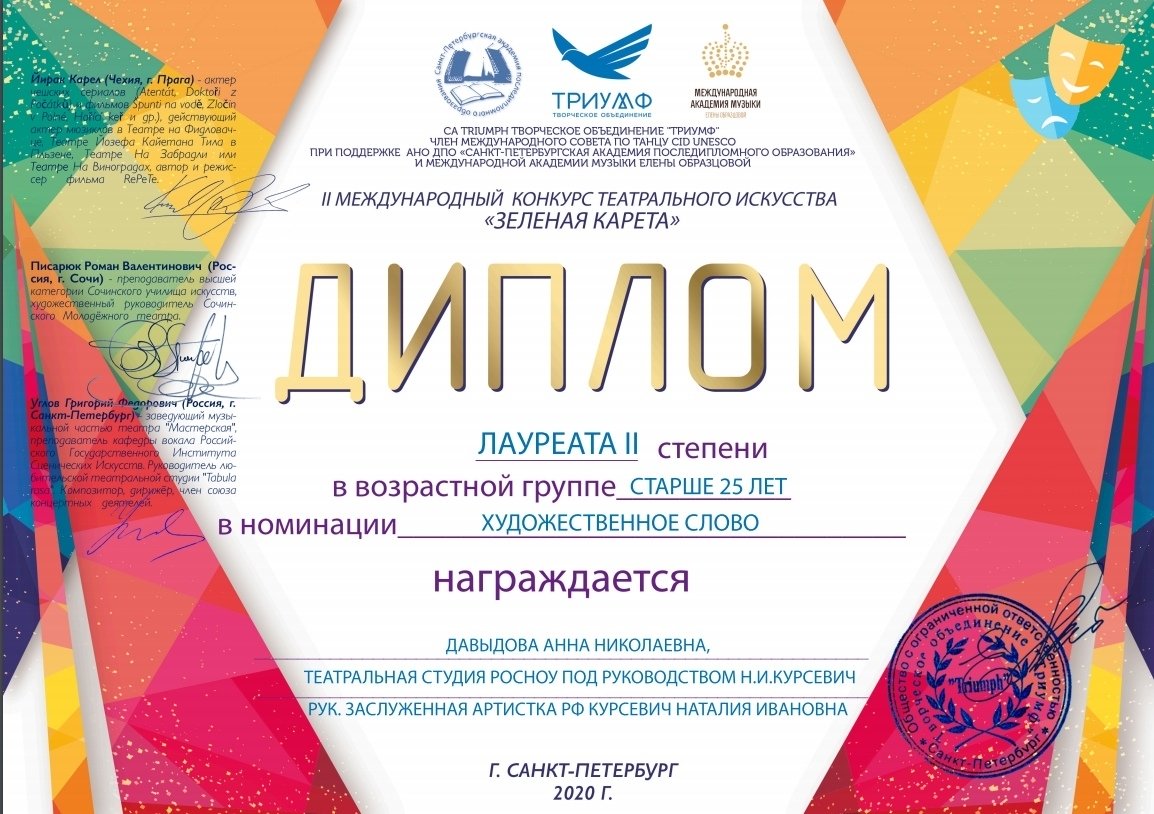 15 мая 2020 года были объявлены итоги II Международного онлайн-конкурса театрального искусства «Зелёная карета», в котором приняли участие артисты Театральной студии Российского нового университета (РосНОУ).
