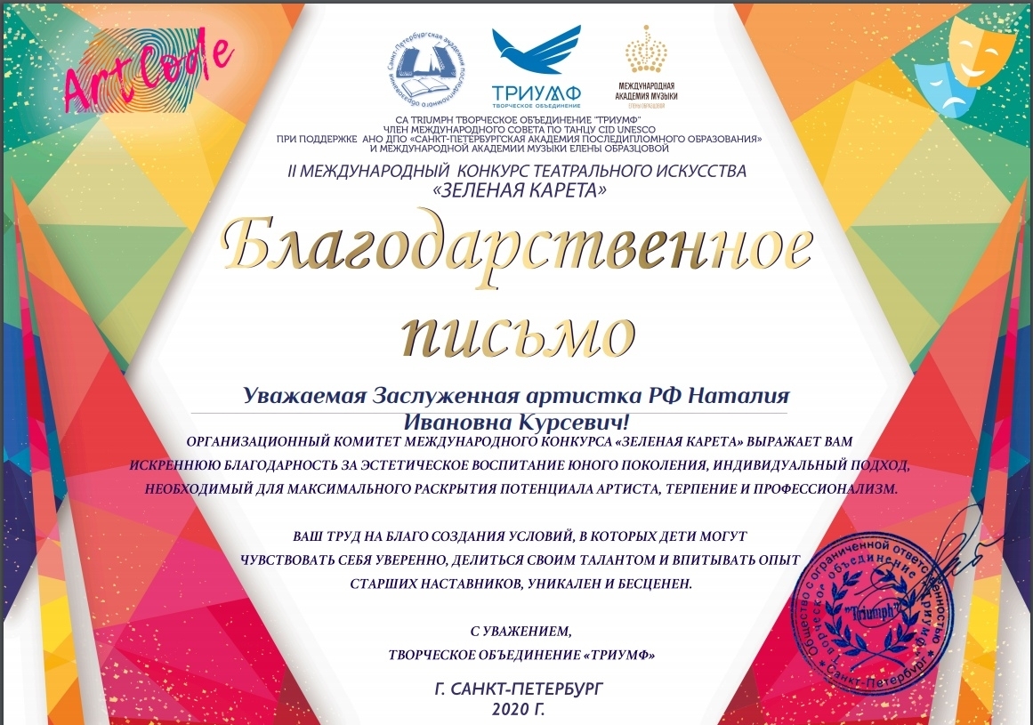 Руководитель Театральной студии РосНОУ, заслуженная артистка РФ, актриса ЦАТРА Наталия Ивановна Курсевич отмечена благодарственным письмом «За эстетическое воспитание юного поколения, индивидуальный подход к ученикам, терпение и профессионализм».