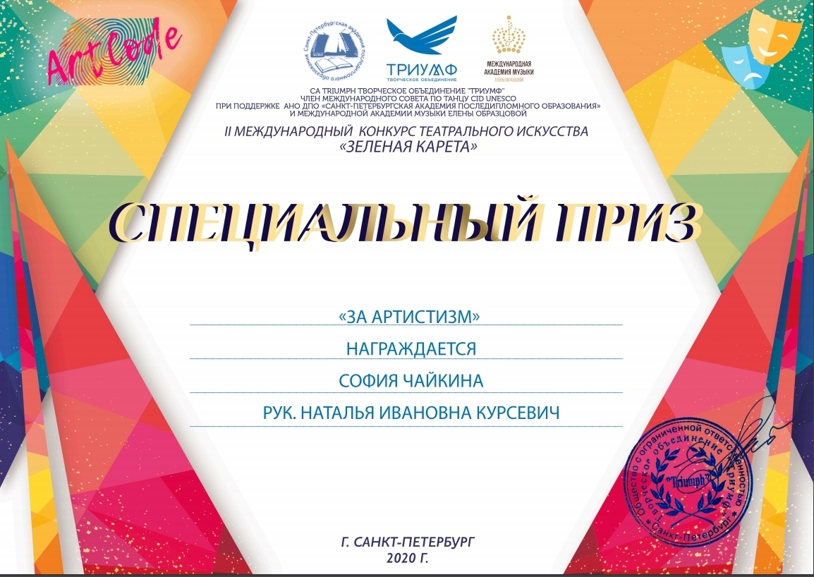 София Чайкина отмечена специальным призом жюри «За артистизм» и дипломом лауреата I cтепени за фрагмент из сказки Д. Дональдсон «Груффало».