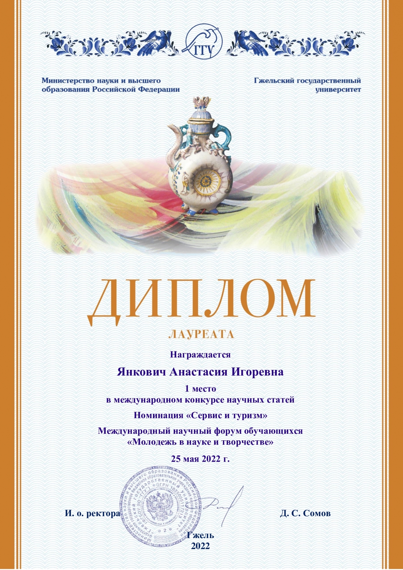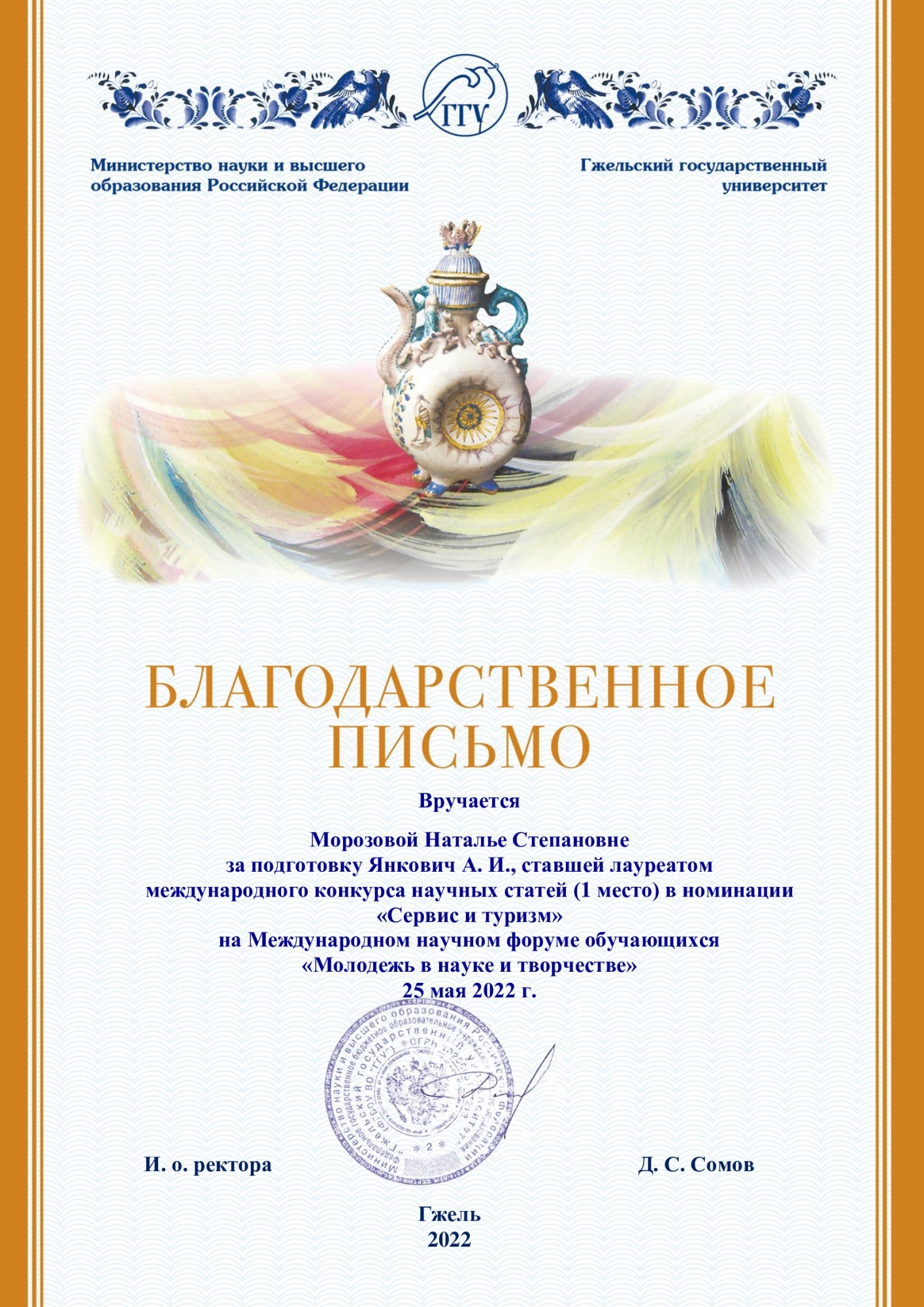 — Тематика конкурса «Сервис и туризм в контексте культуры» интересна, и я предложила Анастасии Янкович поучаствовать в конкурсе, пропагандирующем культурное разнообразие нашей страны, — рассказывает научный руководитель аспирантки Наталья Степановна Морозова, доктор экономических наук, профессор кафедры туризма и гостиничного дела РосНОУ.