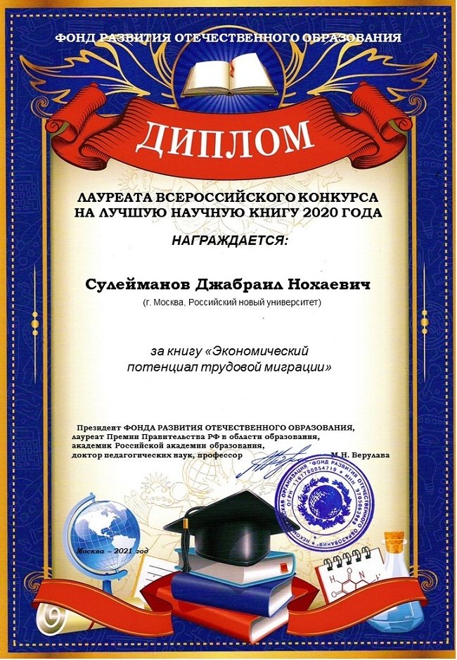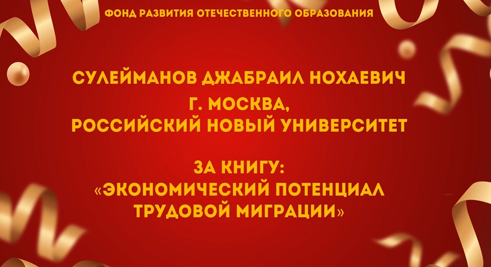 В номинации «Экономика» была отмечена книга «Экономический потенциал трудовой миграции». Её автор, директор Налогового института РосНОУ Джабраил Нохаевич Сулейманов, получил диплом лауреата конкурса.