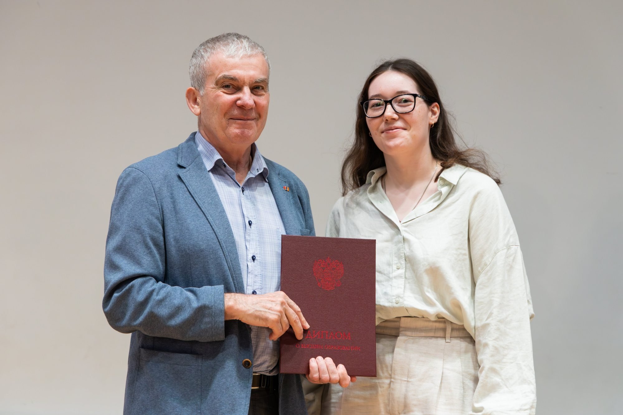 Дипломы с отличием — а их на ИСИКТ в этом году 24 — вручал ректор РосНОУ Владимир Алексеевич Зернов.