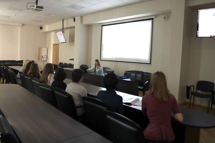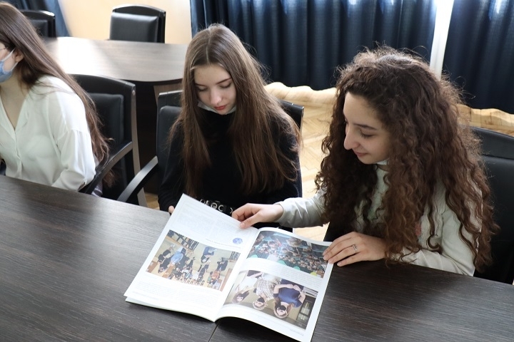 В 523 аудитории руководитель студенческого медиацентра E-NOTE Елена Жилудько рассказала делегации о работе команды медиацентра, подготовке информационных и тематических материалов для сайта и соцсетей и создании лонгридов и подкастов. Затем E-NOTE вместе со школьниками обсудил медиапродукцию департамента управления информацией РосНОУ — «Газету Радио, 22», университетский сайт — и ведение каналов в Telegram и Яндекс.Дзене.