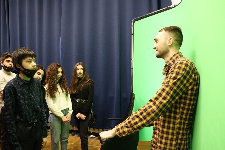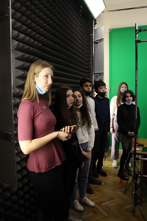 Студенческий медиацентр РосНОУ провёл для гостей экскурсию по университету и показал видеостудию, где проходит запись интервью, подкастов и лекций. Технические администраторы РосНОУ Дмитрий и Андрей Давыдовы и начальник управления информатизации Борис Леонидович Гуськов рассказали о технических возможностях видеостудии, программном обеспечении и оборудовании.
