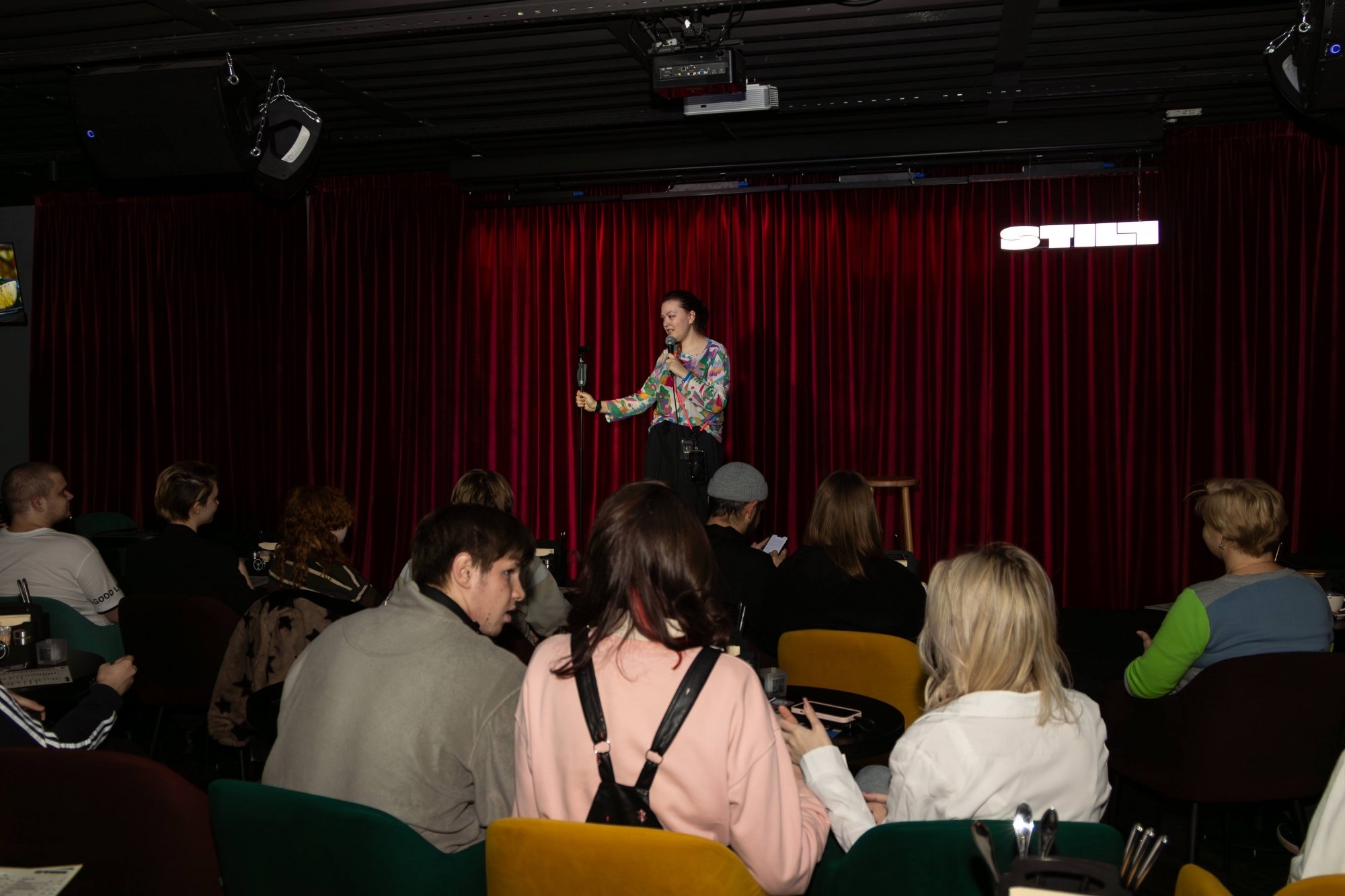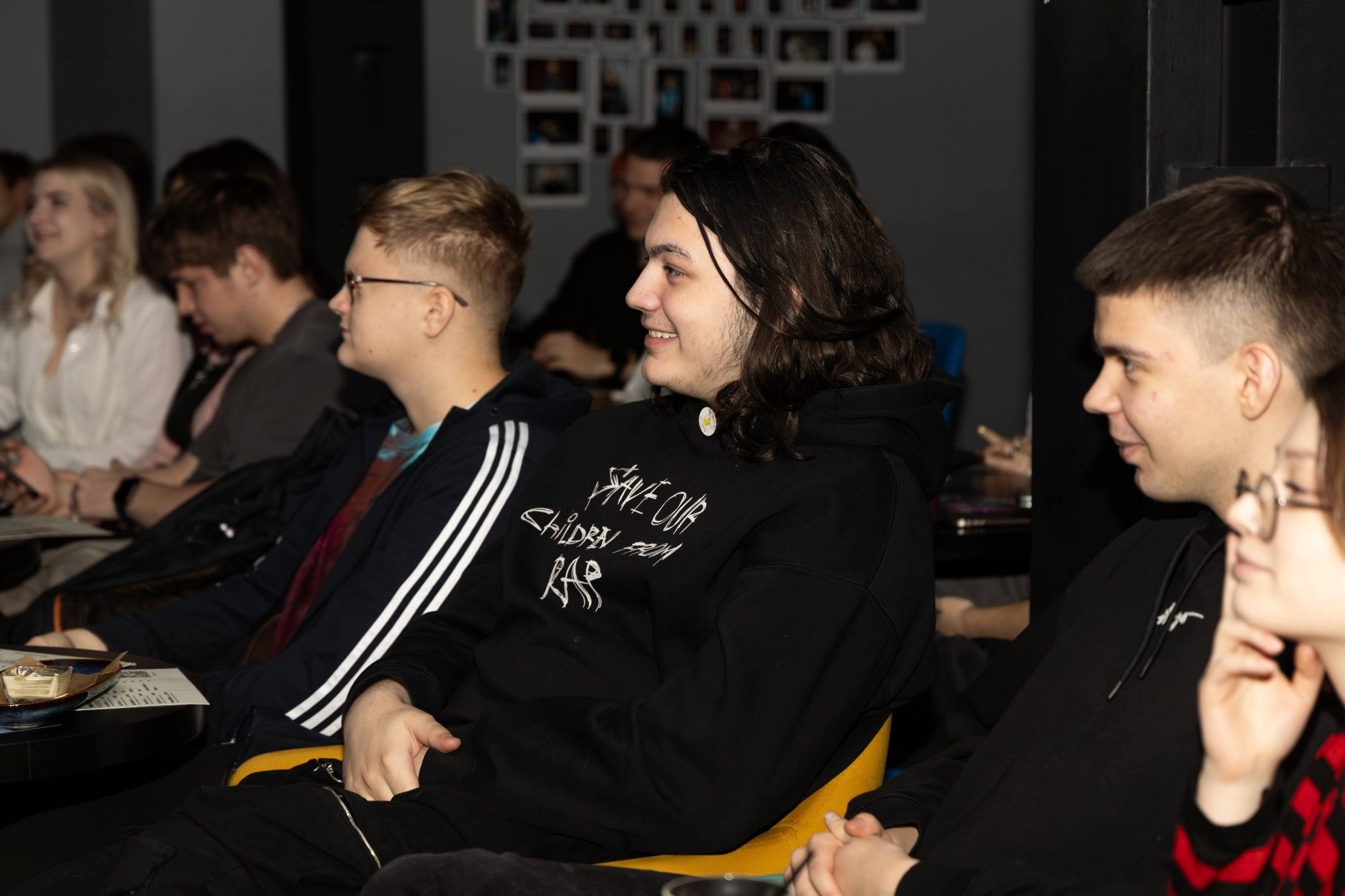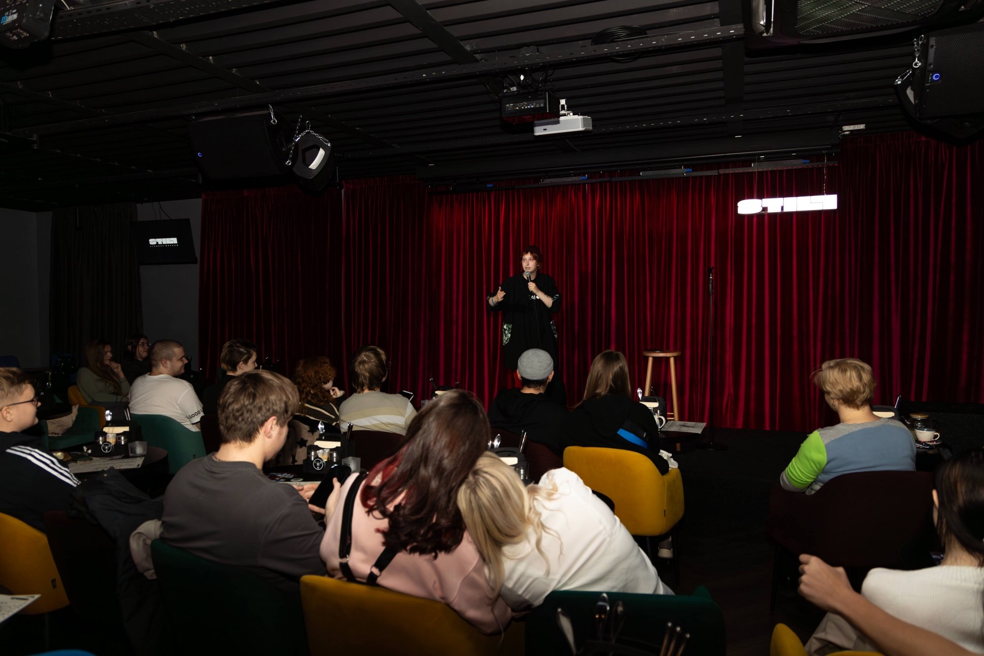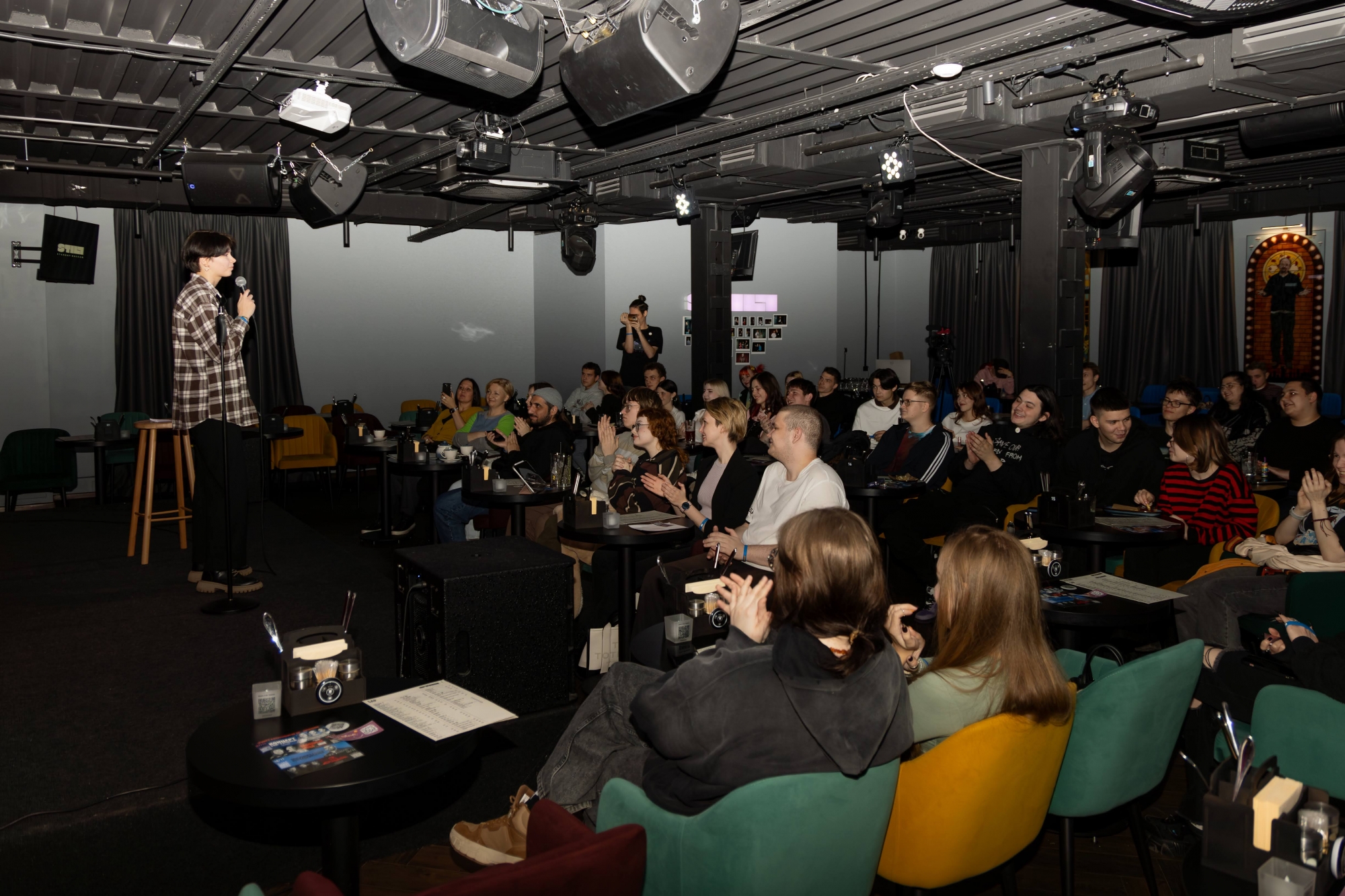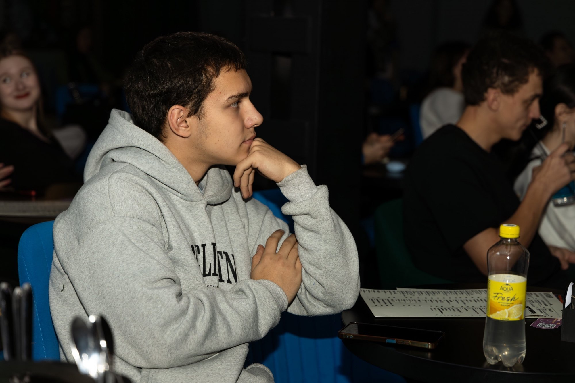 На сцену также вышли гости Студии комедии РосНОУ Елизавета Головина (Владивосток), Физули Ибадов (Саратов) и Влад Городничев (Нижний Новгород) — стендап-комики, которые выступают на профессиональных площадках.