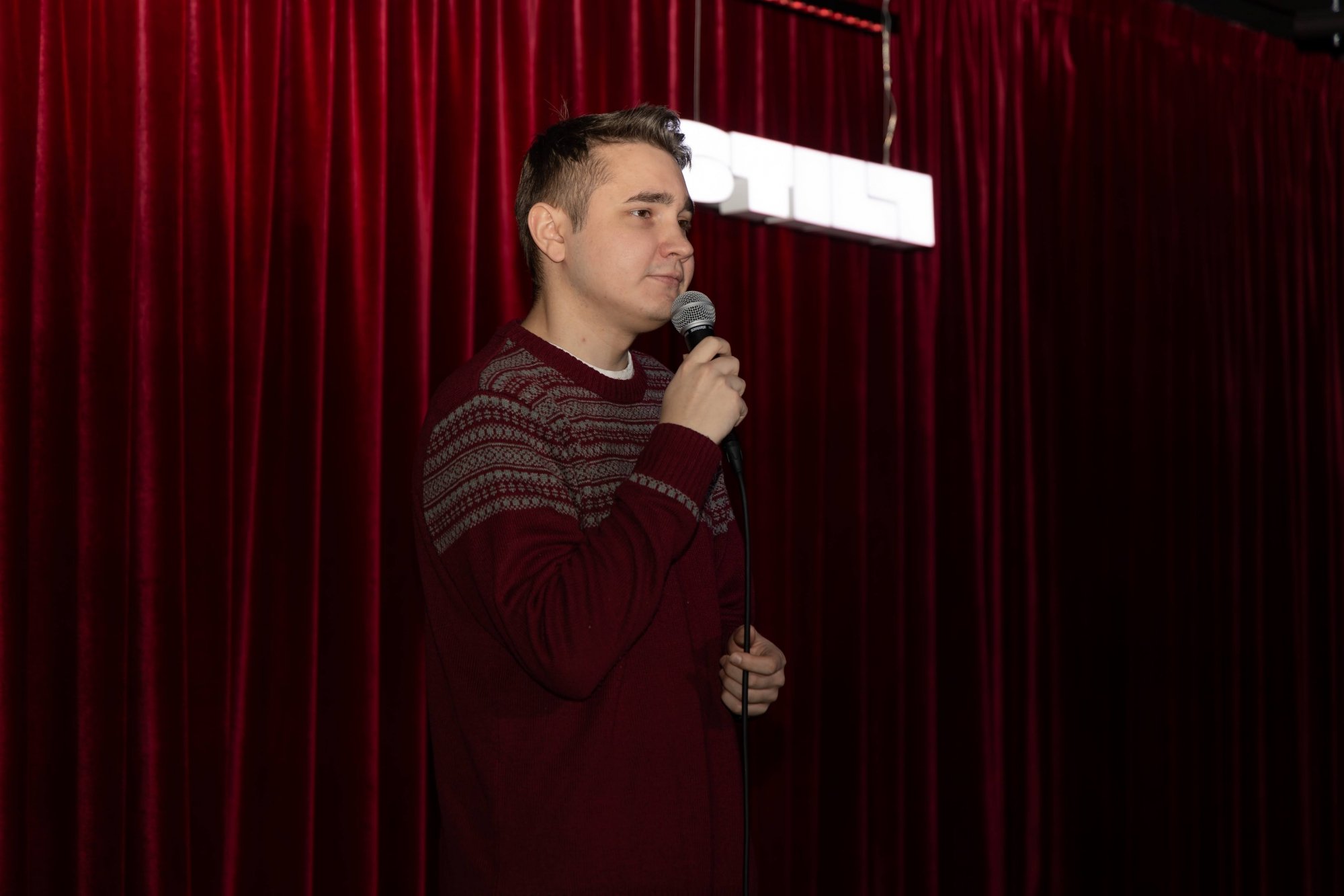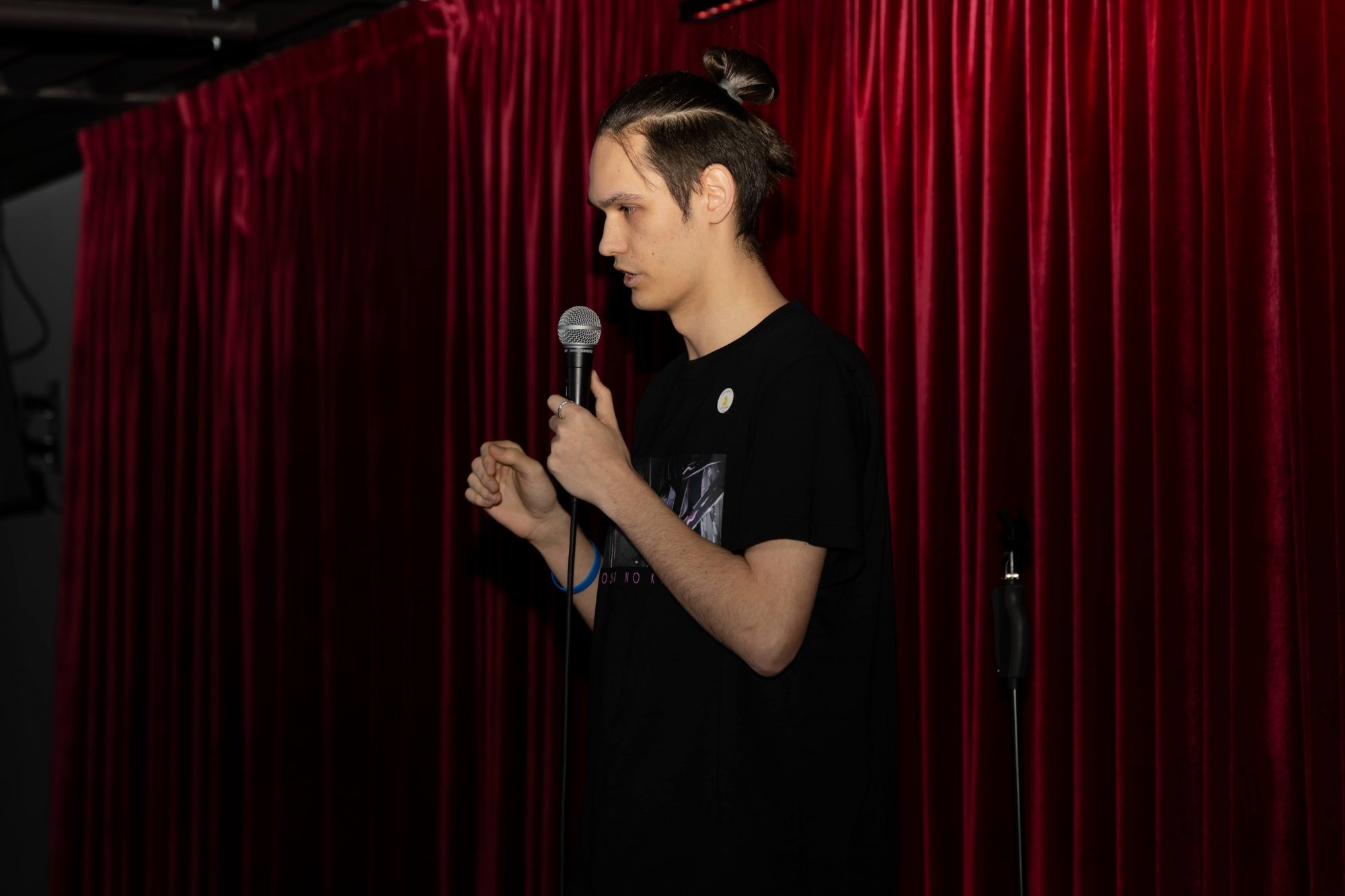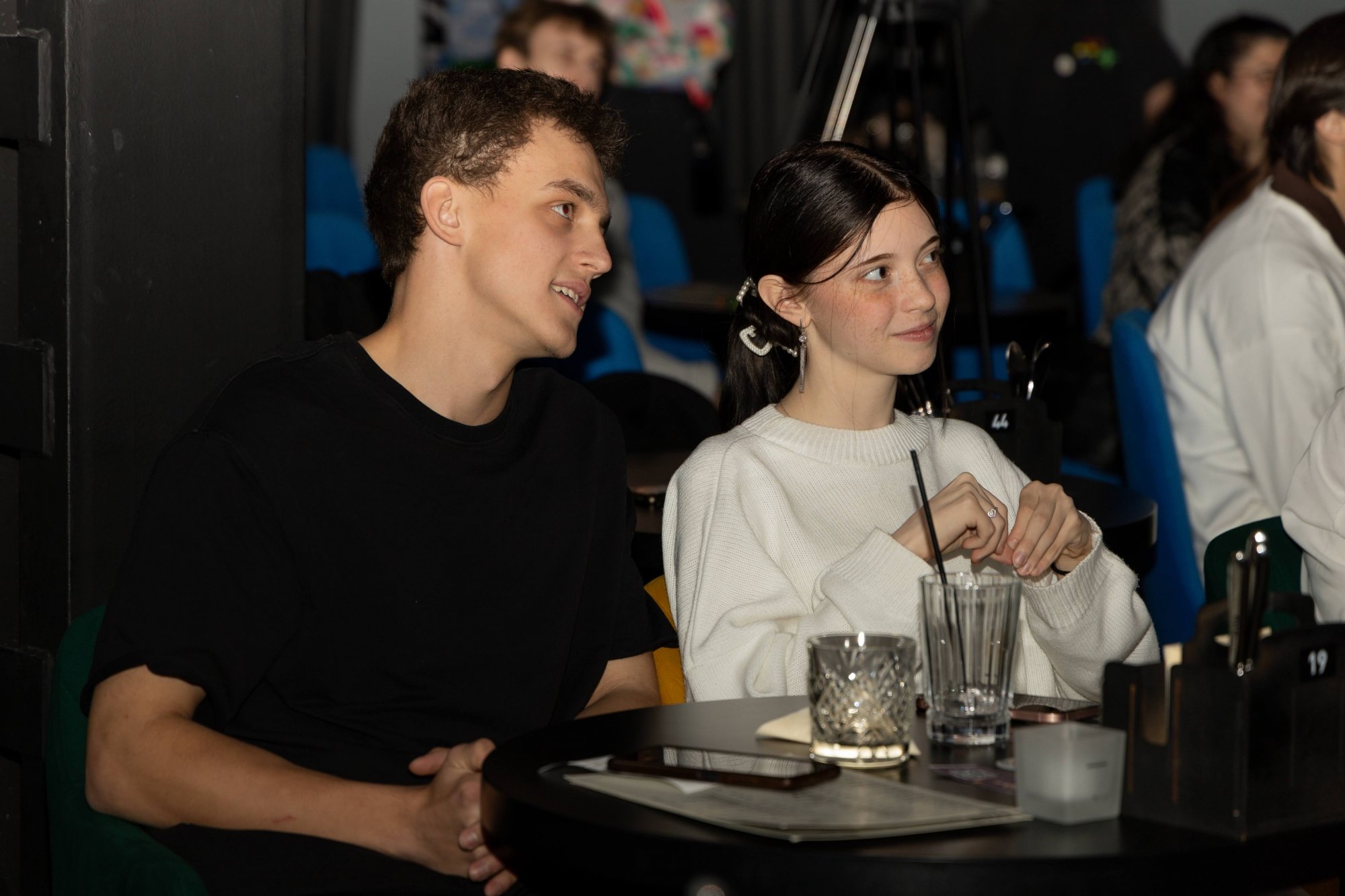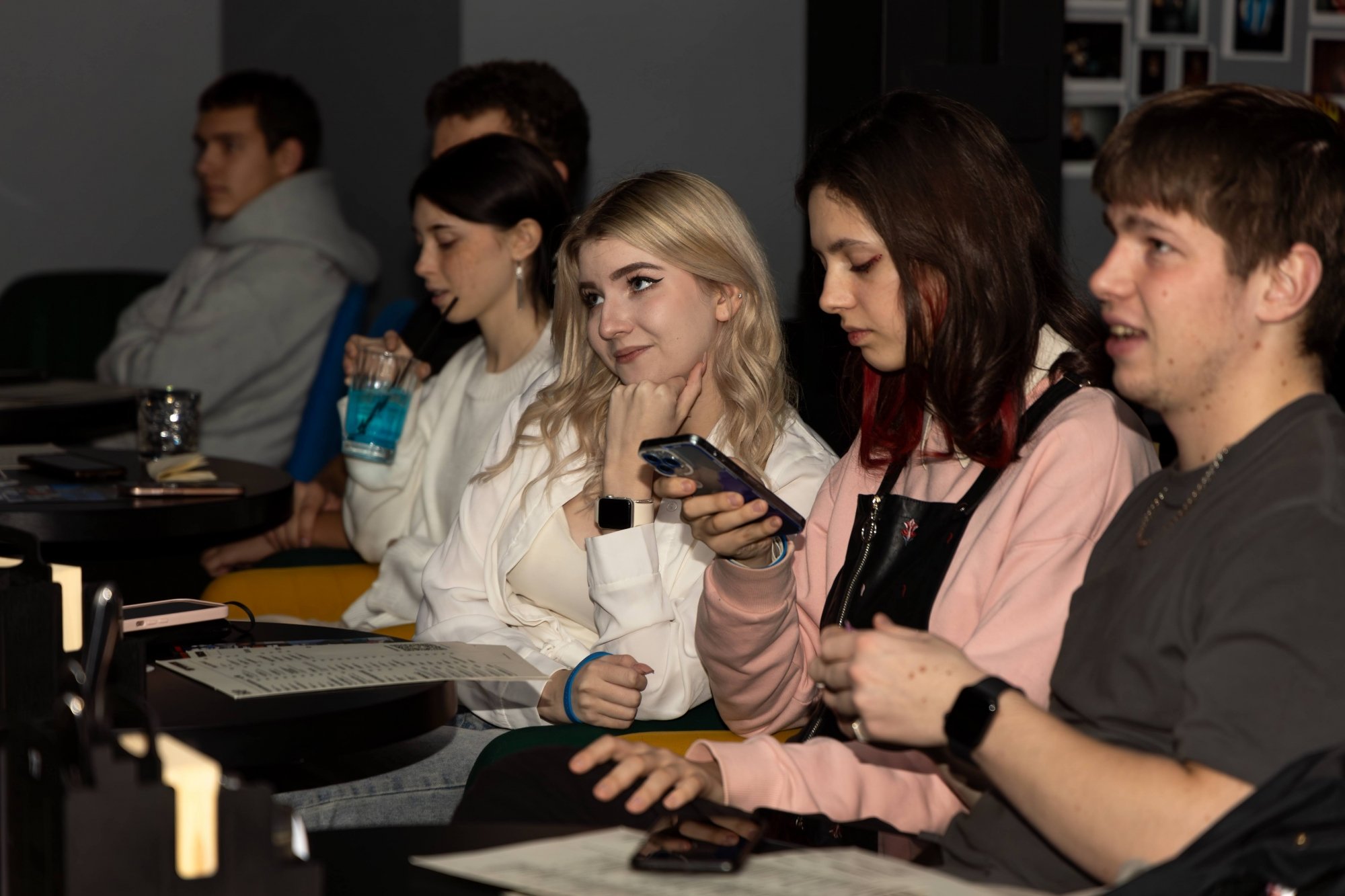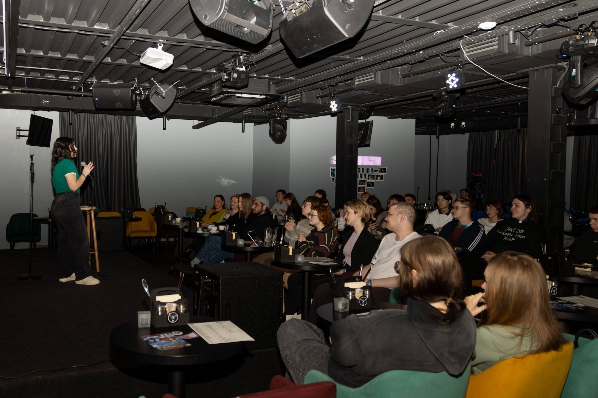 На сцену также вышли гости Студии комедии РосНОУ Елизавета Головина (Владивосток), Физули Ибадов (Саратов) и Влад Городничев (Нижний Новгород) — стендап-комики, которые выступают на профессиональных площадках.