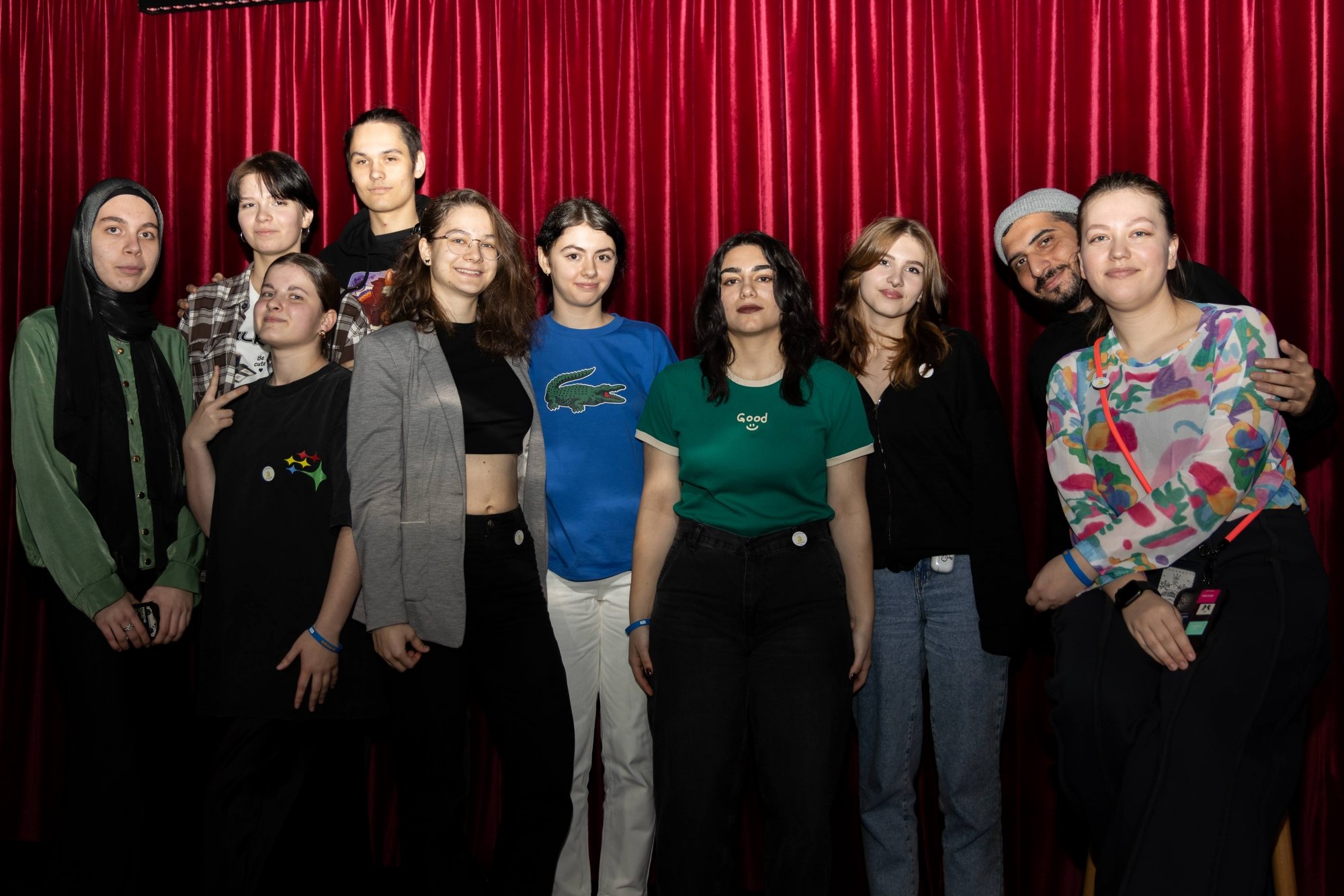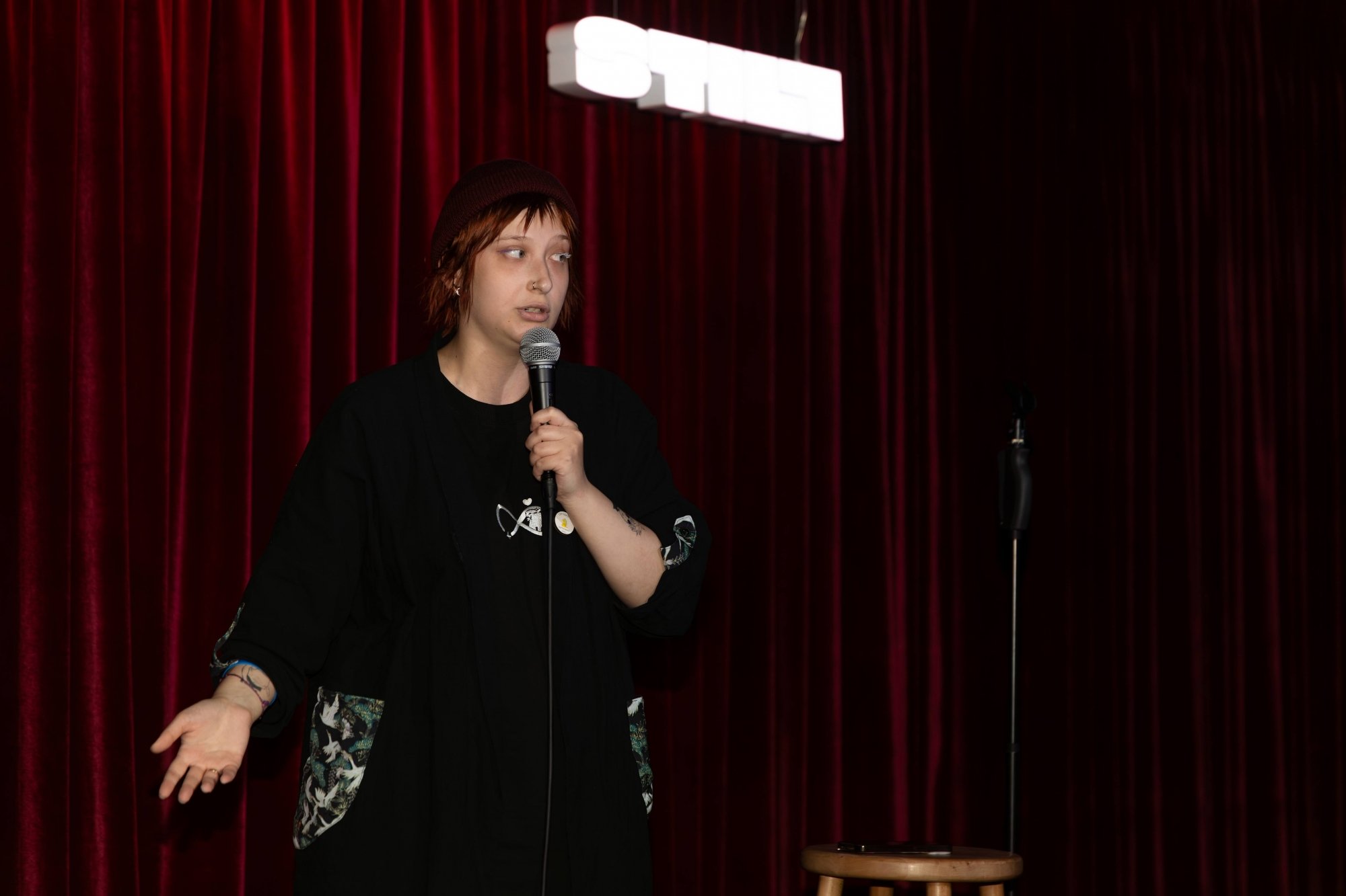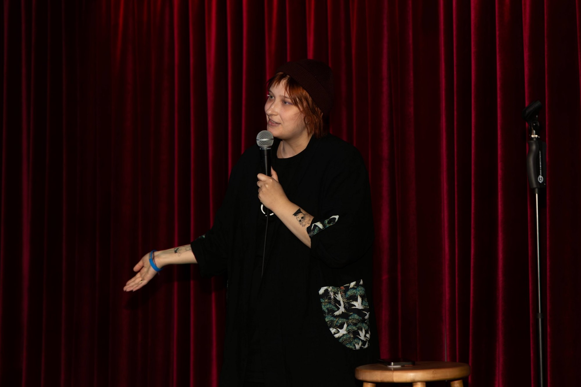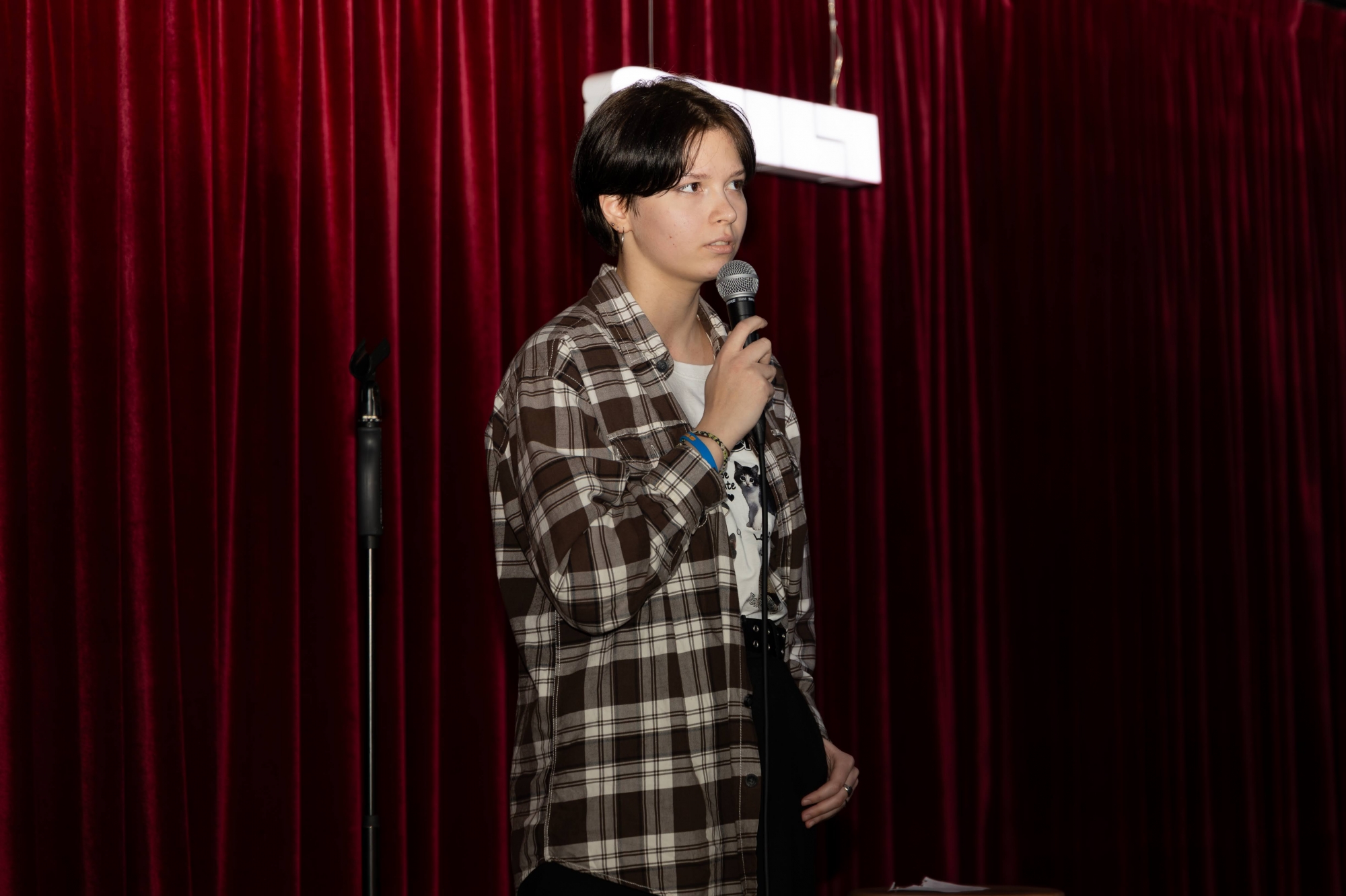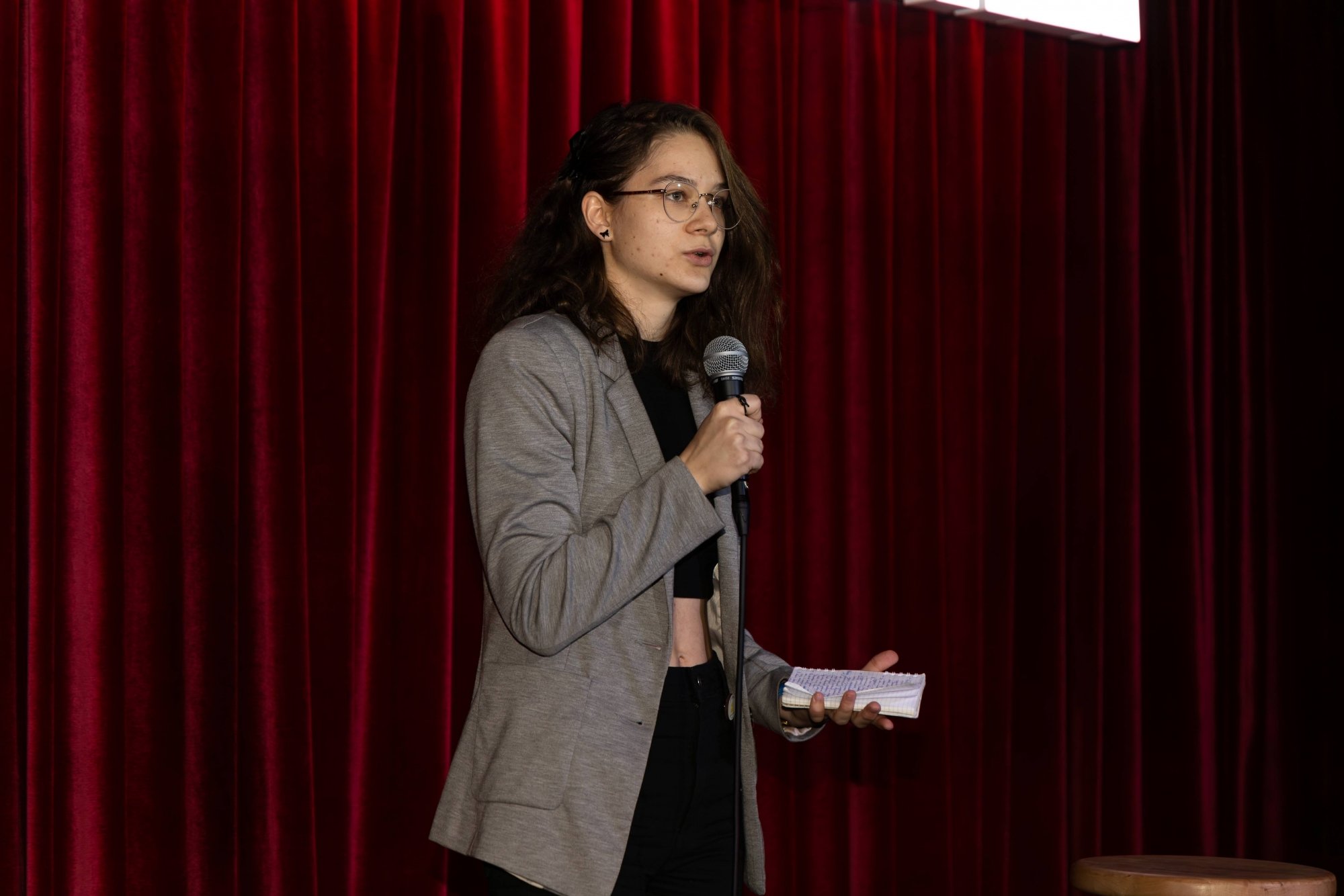 На сцену также вышли гости Студии комедии РосНОУ Елизавета Головина (Владивосток), Физули Ибадов (Саратов) и Влад Городничев (Нижний Новгород) — стендап-комики, которые выступают на профессиональных площадках.