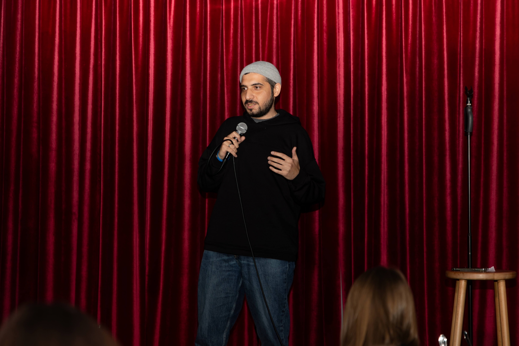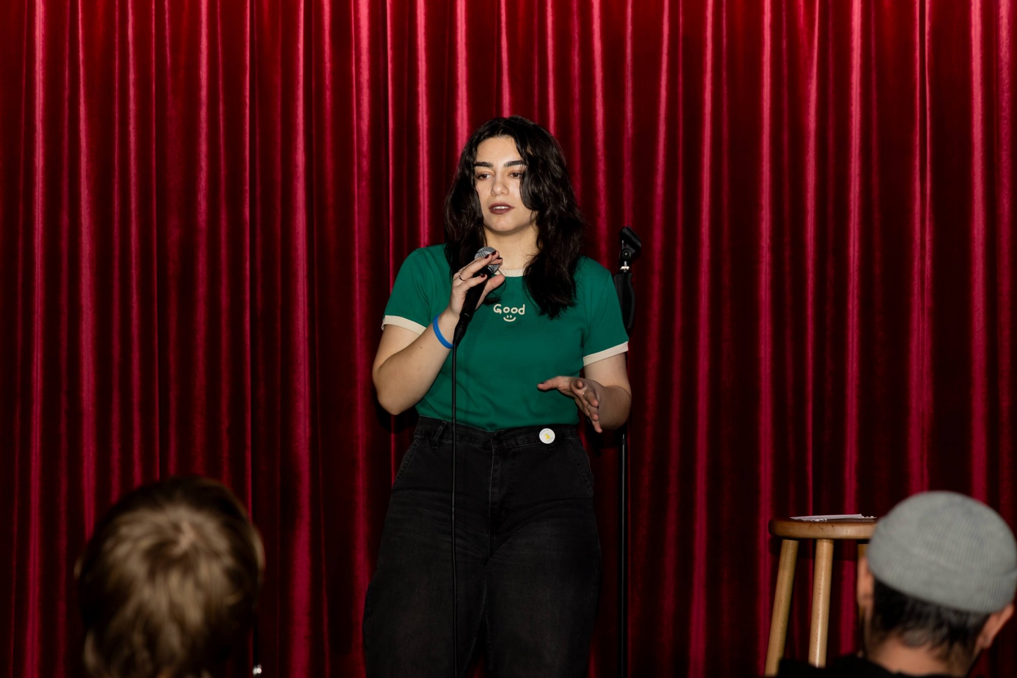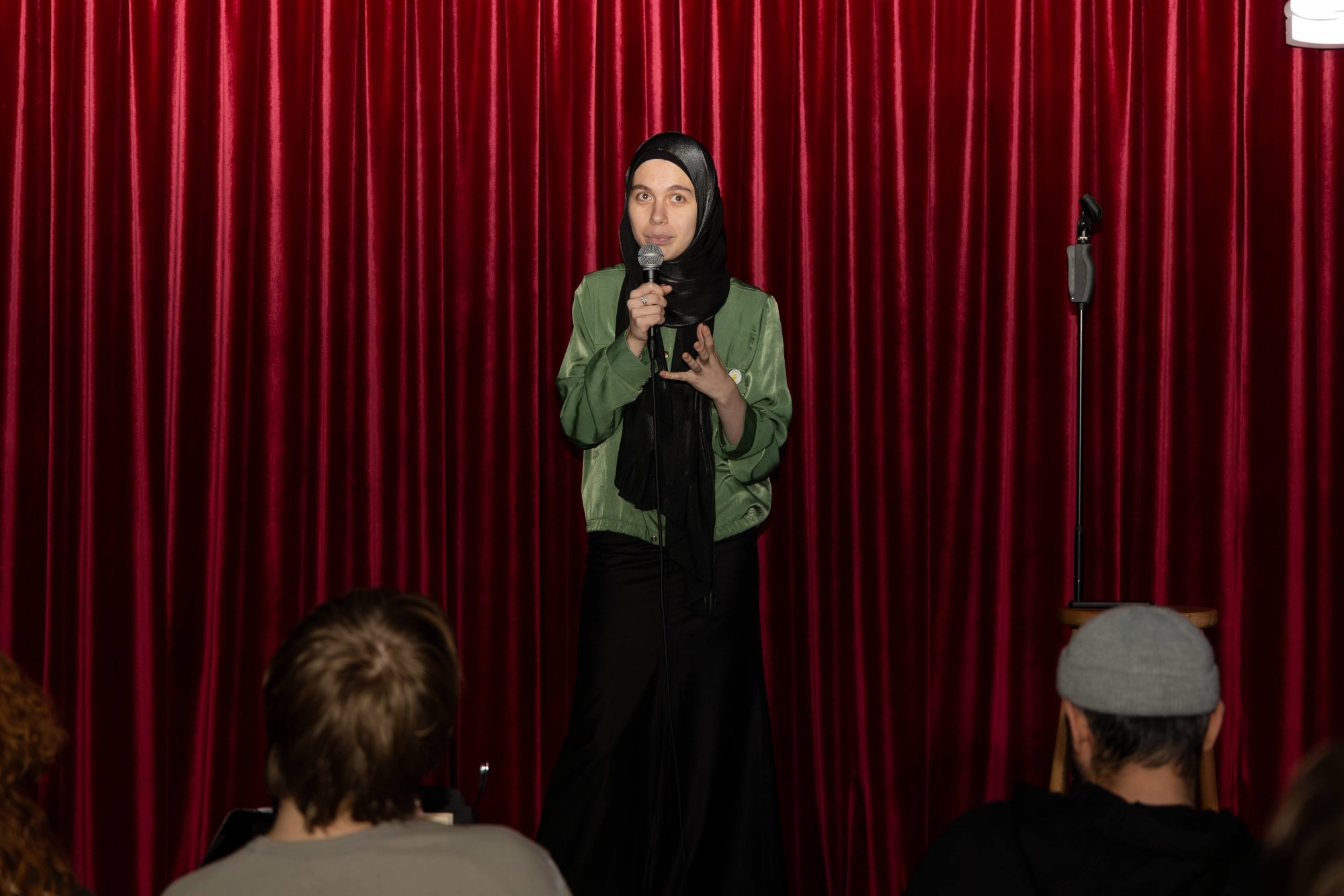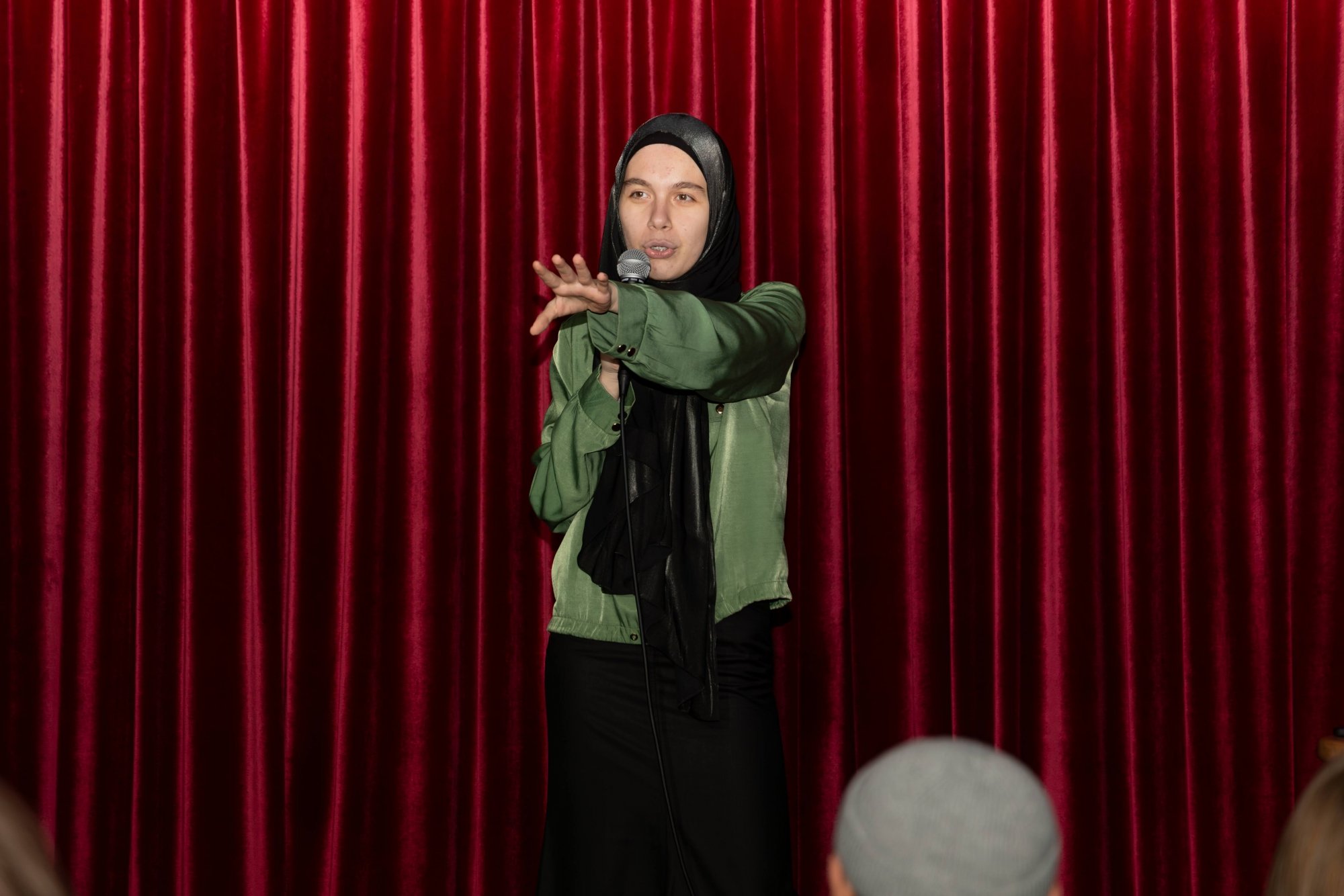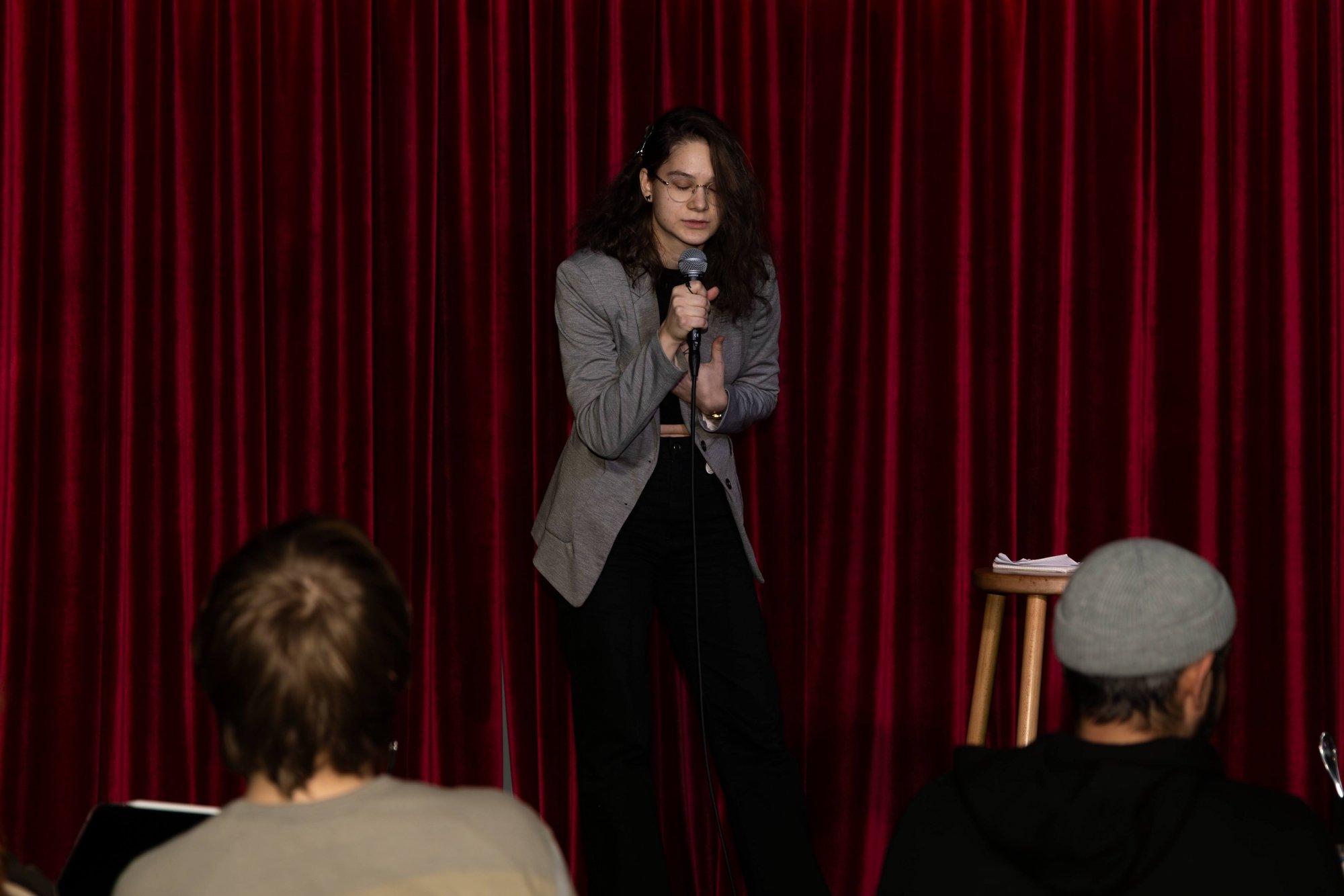 На сцену также вышли гости Студии комедии РосНОУ Елизавета Головина (Владивосток), Физули Ибадов (Саратов) и Влад Городничев (Нижний Новгород) — стендап-комики, которые выступают на профессиональных площадках.