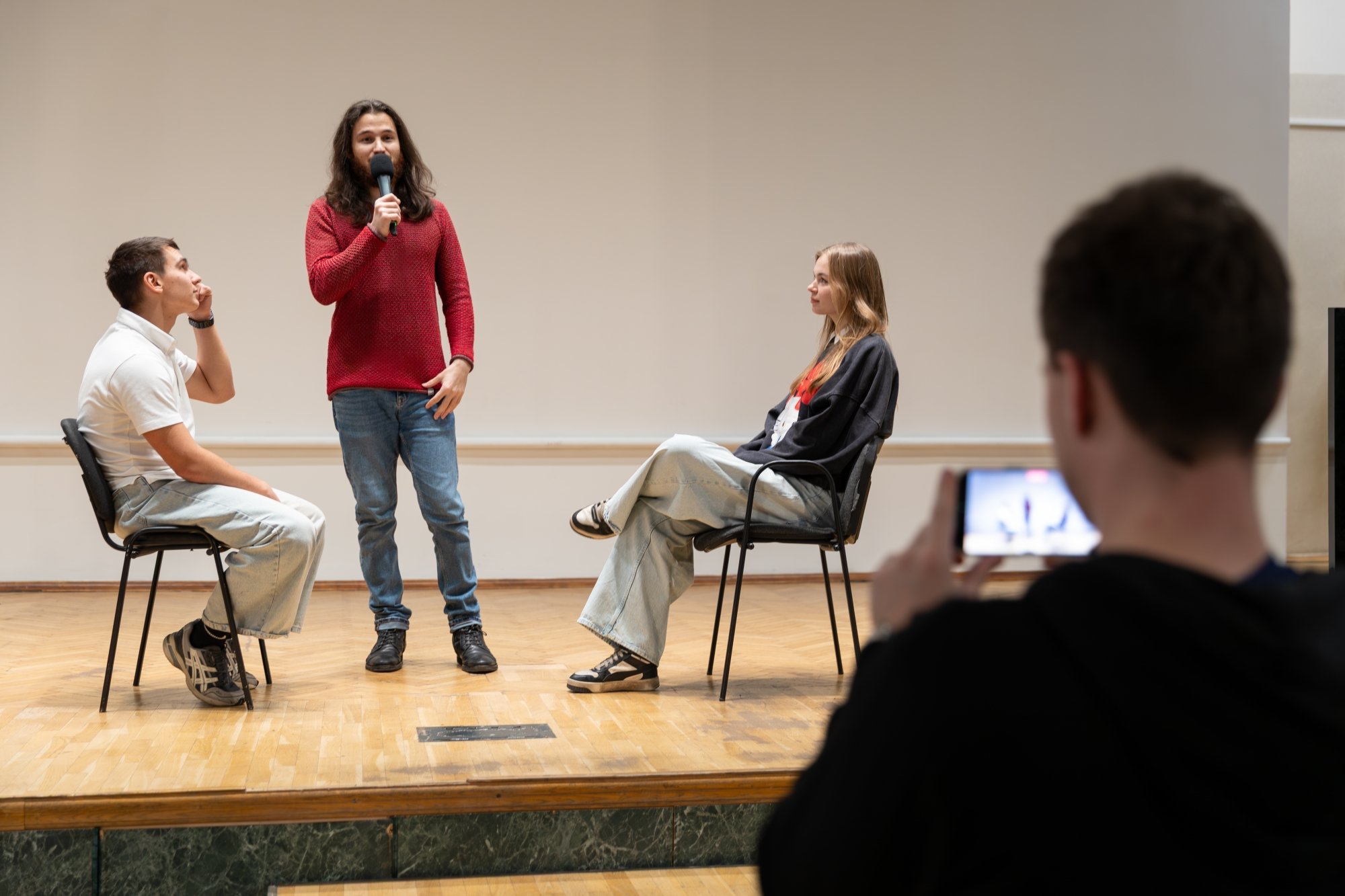 Студенты с увлечением выполняли актёрские упражнения, учились правильно и уверенно представляться, разыгрывали этюды, в которых достигали поставленных сценических задач благодаря импровизационным диалогам. Им было весело, интересно и, надеюсь, полезно.