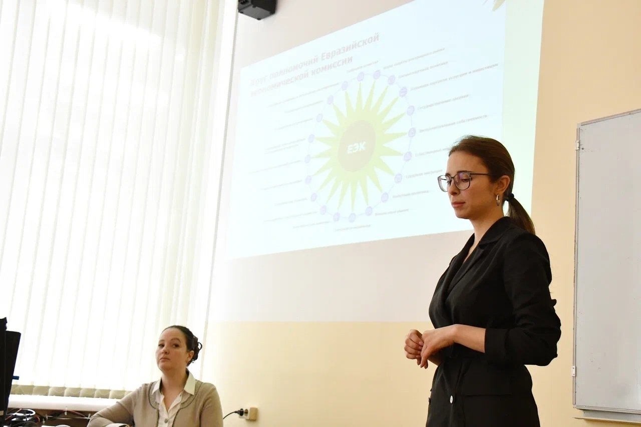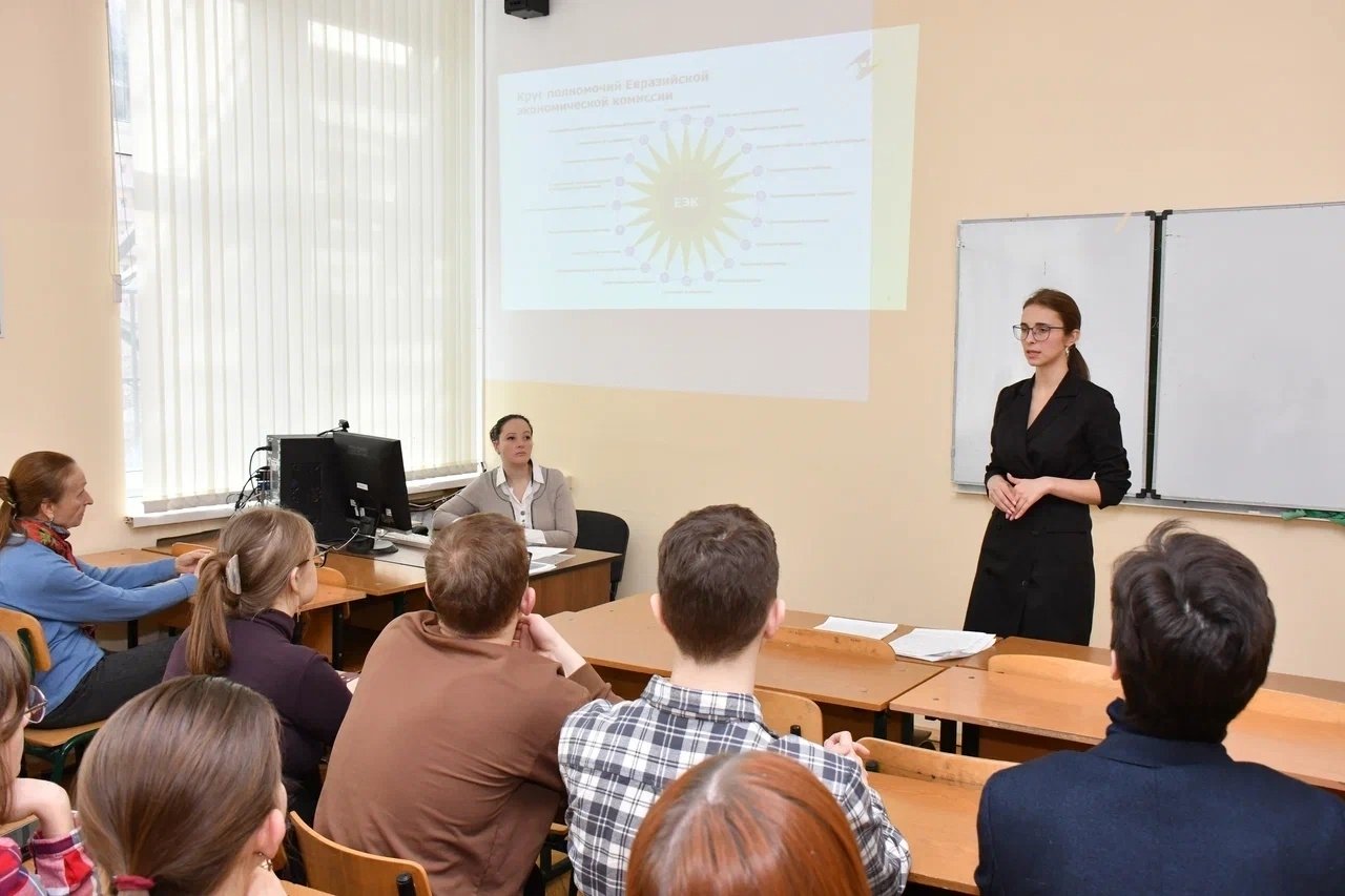 Тематика выступления касалась международного сотрудничества ЕАЭС и перспектив его развития. Организовала встречу представителя этого уважаемого ведомства с первокурсниками кандидат юридических наук, доцент Наталия Феликсовна Кислицына.