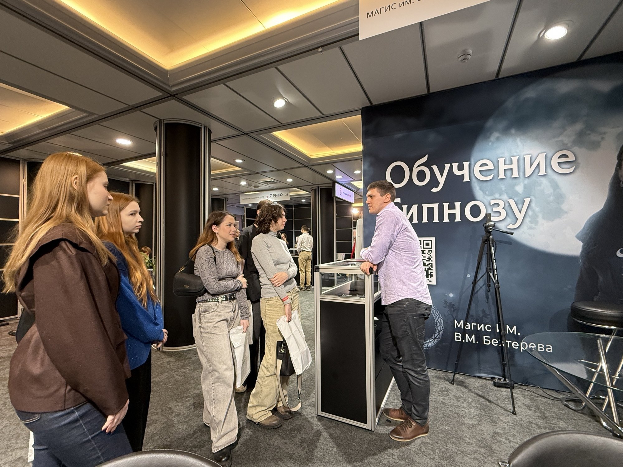 Студенты ознакомились со стендами образовательных организаций, где узнали о программах повышения квалификации и инновационных методиках в психологии. Они пообщались с практикующими специалистами, изучили современные психологические продукты и протестировали профессиональные инструменты. Также участники познакомились с различными направлениями практической психологии, в том числе с КПТ, гипнозом, символдрамой и альтернативными подходами.