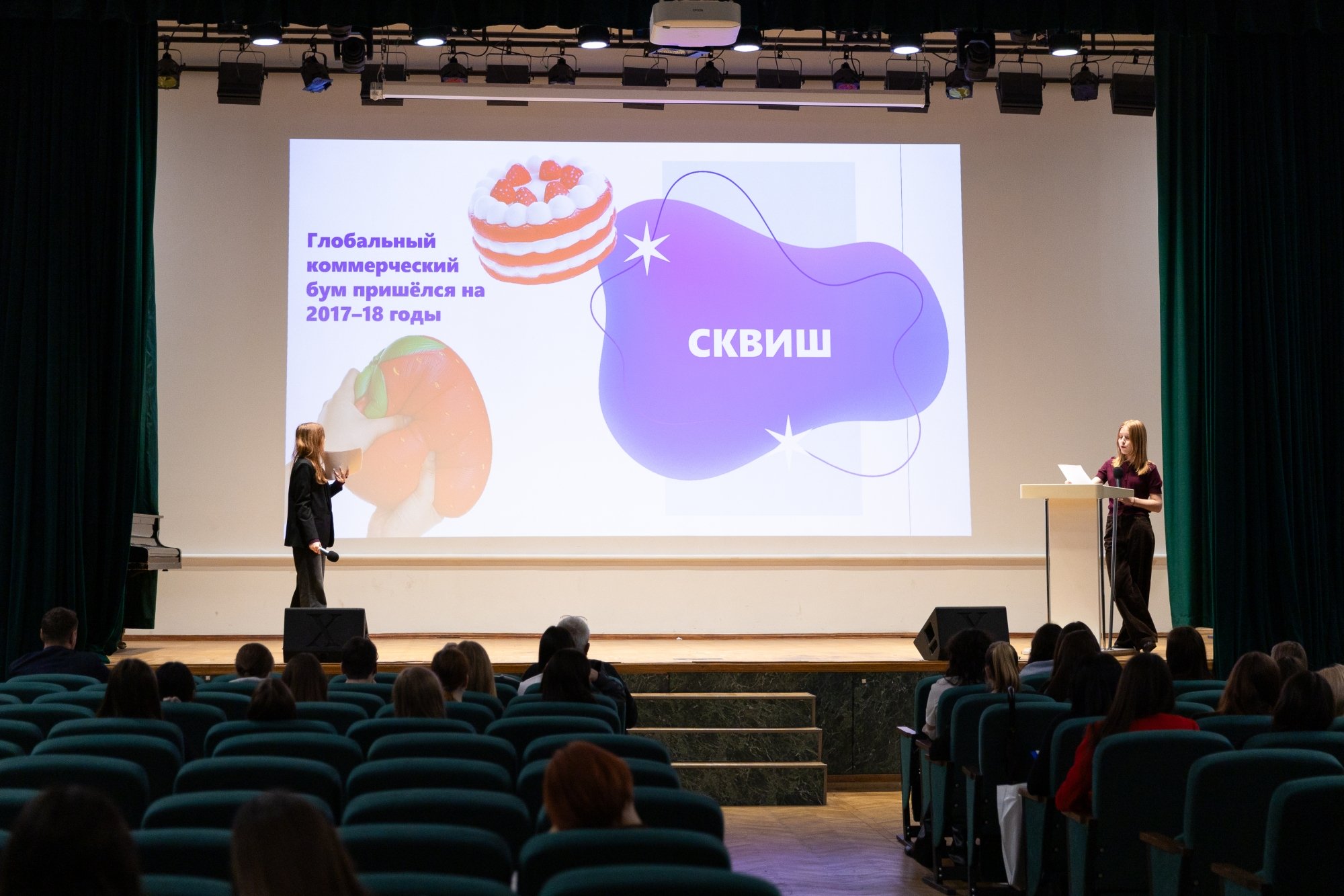 1 место. Кузнецова Альбина, Ткач Анастасия (Колледж РосНОУ), доклад «Спекуляция на негативе: как бренды эксплуатируют хит и сплетни в рекламных целях»; Канашева Анна, Тарасова Виктория (Колледж РосНОУ), «Как менялись тренды рекламы за последние 10 лет».