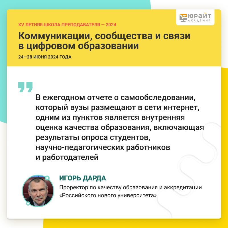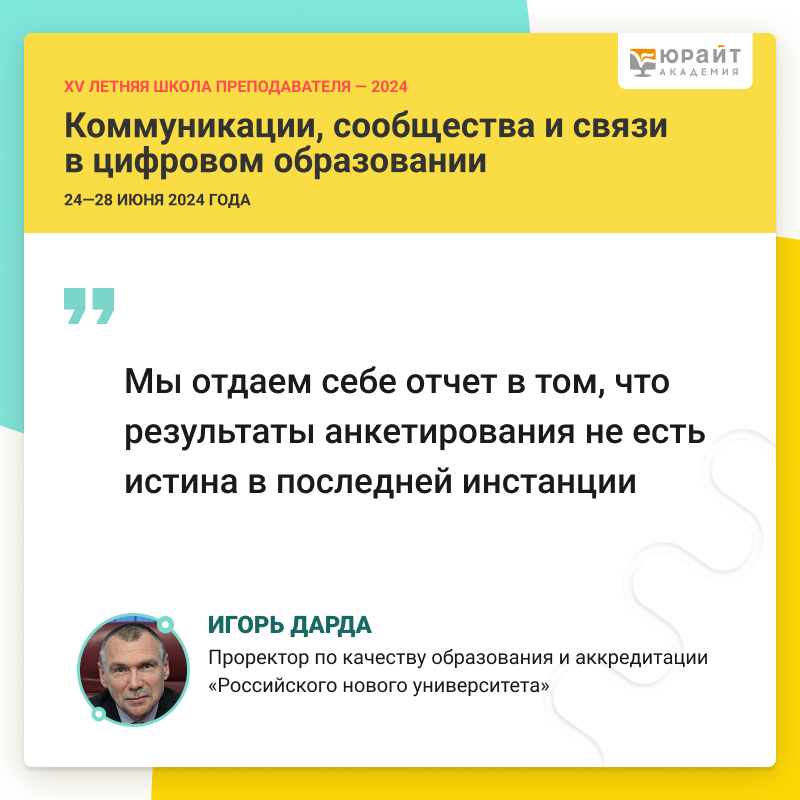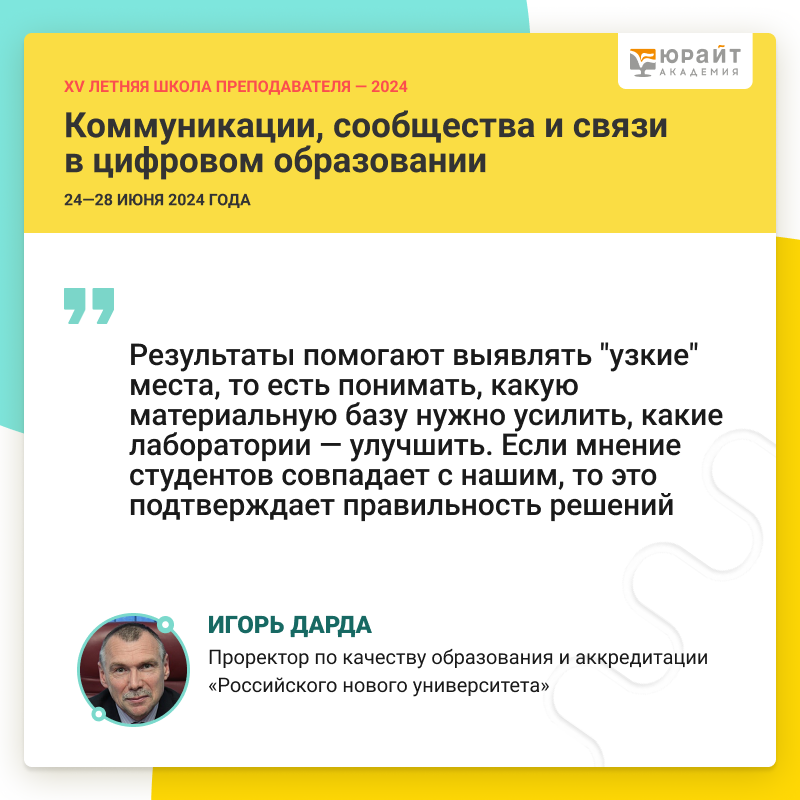 28 июня в Юрайт.Академии состоялась онлайн-дискуссия «Голос аудитории: системная обратная связь и отзывы студентов» в рамках XV Летней школы преподавателя «Коммуникации, сообщества и связи в цифровом образовании». О пользе анализа мнений обучающихся рассказал проректор по качеству образования и аккредитации Российского нового университета, доктор технических наук, профессор Игорь Дарда.