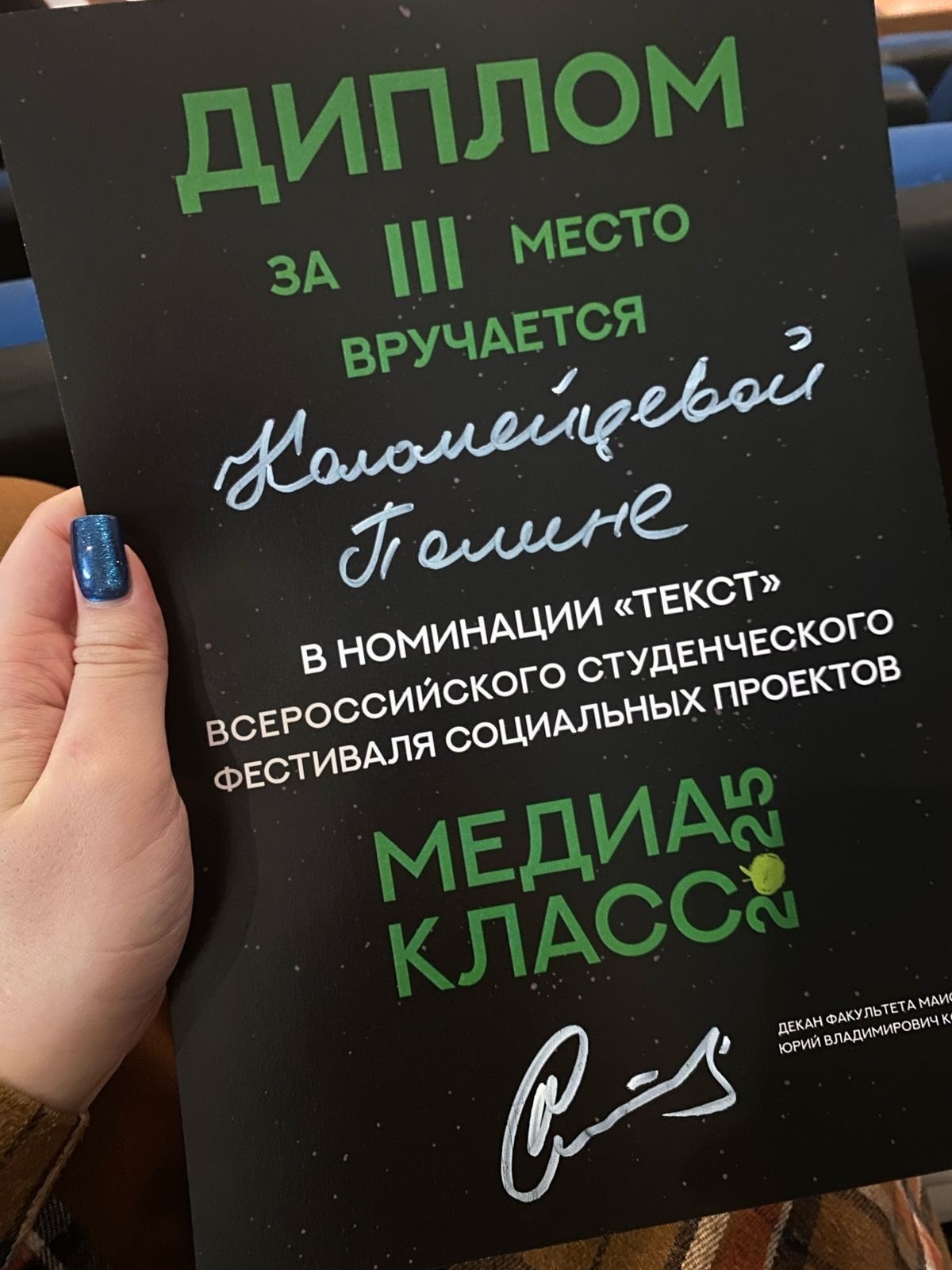 Работа Полины заслуженно получила высокую оценку жюри. У неё отлично развиты навыки копирайтинга. Для поколения, где коммуникация часто строится на эмодзи, такое умение — редкость. Оно повысит её конкурентоспособность в рекламной сфере.