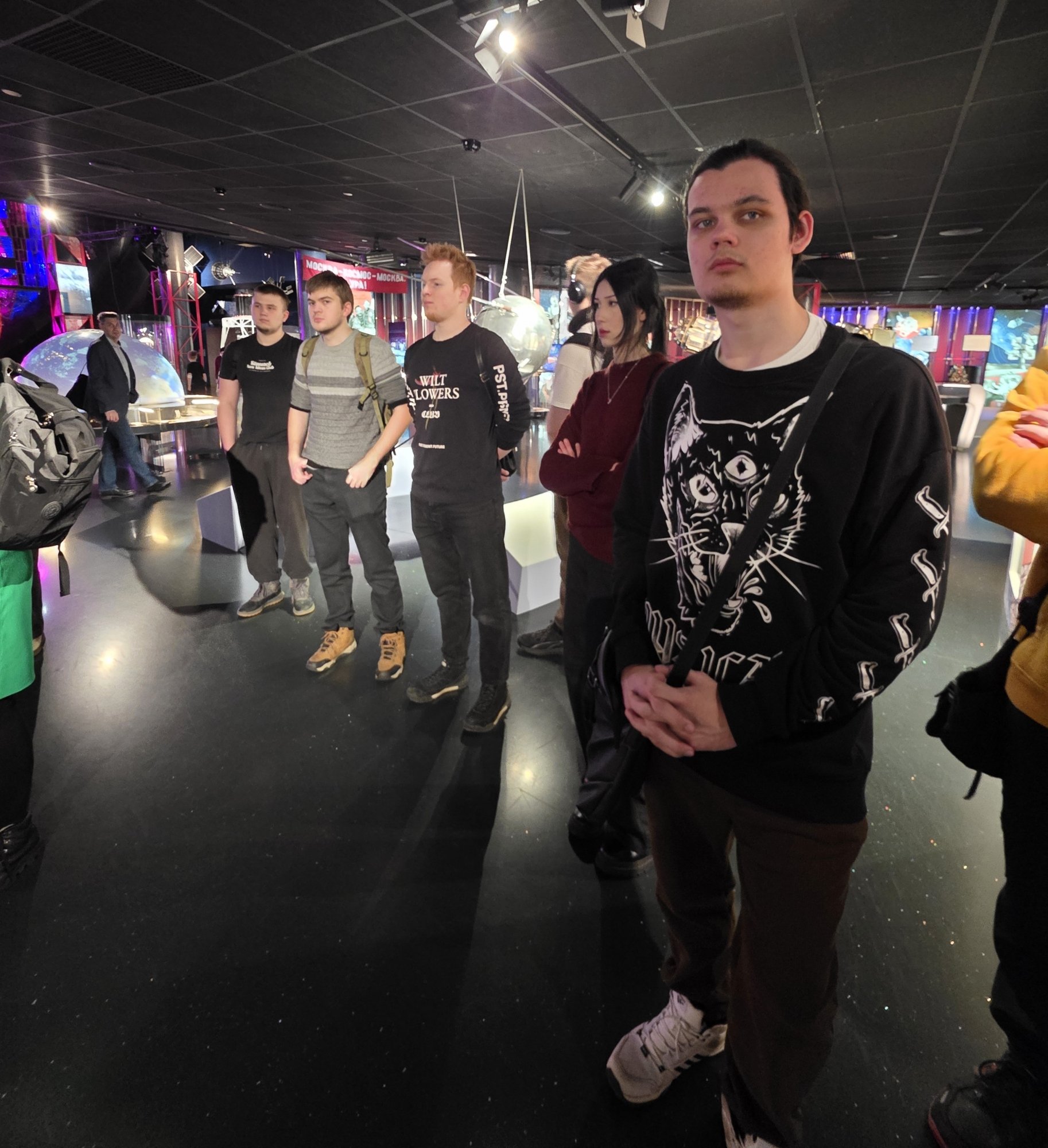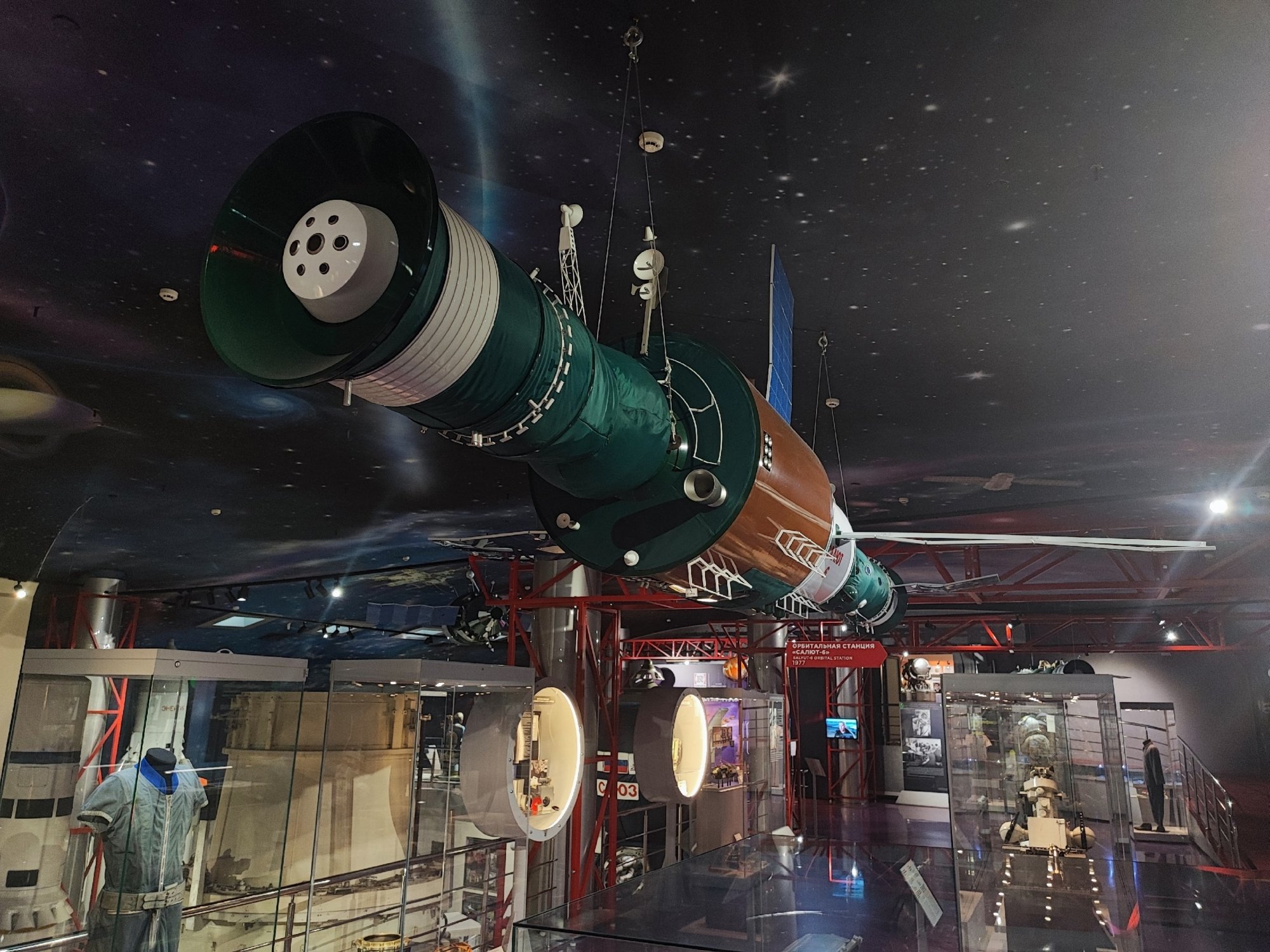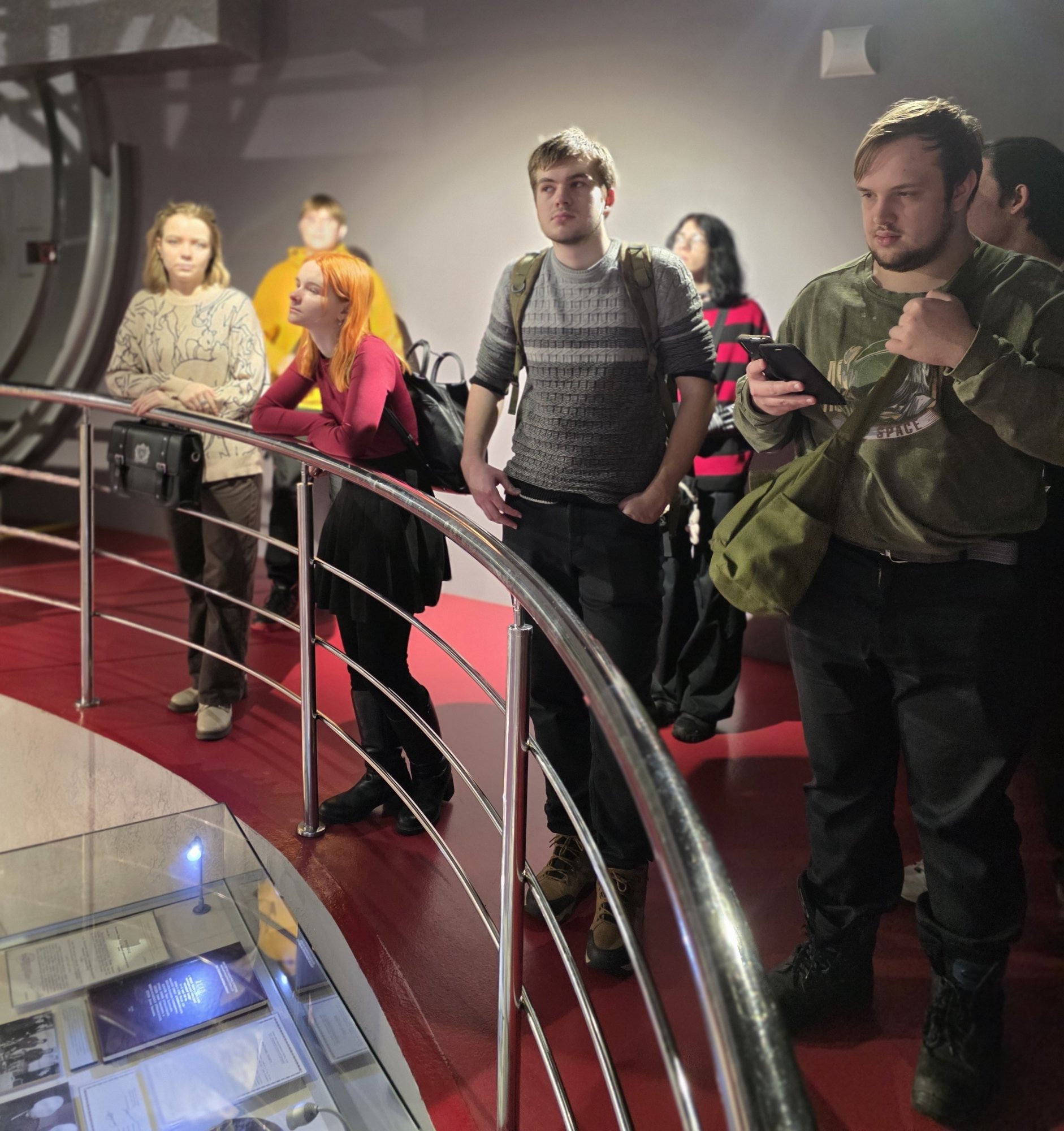 Обзорную экскурсию провела сотрудница фондохранилища музея Наталья Сергеевна Нецветаева. Она рассказала о спускаемых аппаратах по программам исследования Венеры и Марса, показала возвращаемую баллистическую капсулу «Радуга», доставлявшую на Землю материалы с результатами орбитальных исследований, а также полноразмерный макет базового блока станции «Мир», внутрь которого студентам разрешили зайти. Посетители увидели, как космонавты спят (пристёгиваясь к стене), принимают пищу, работают и пользуются велотренажёром, закреплённым на потолке.