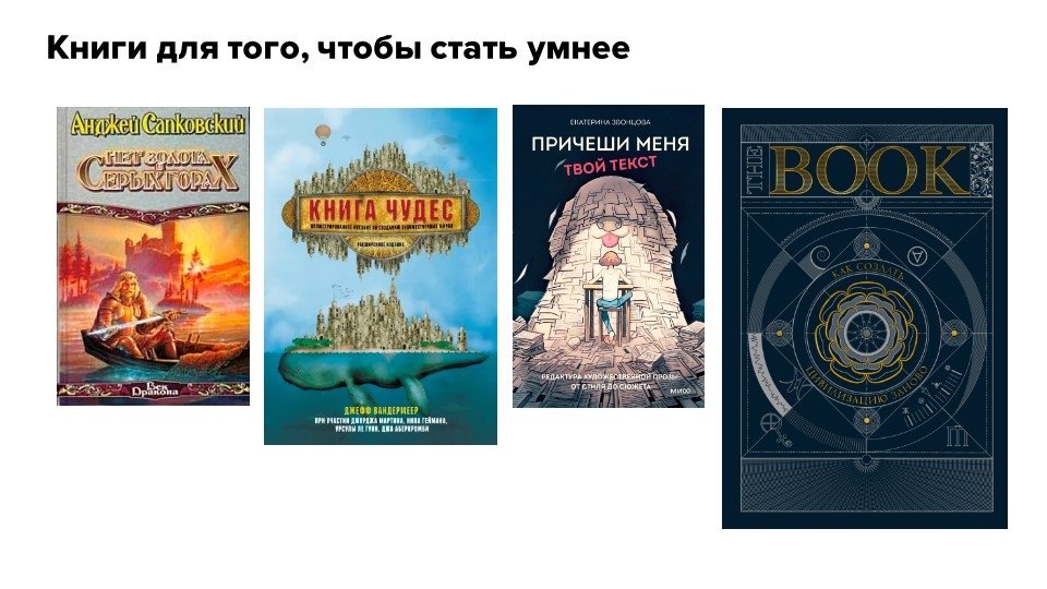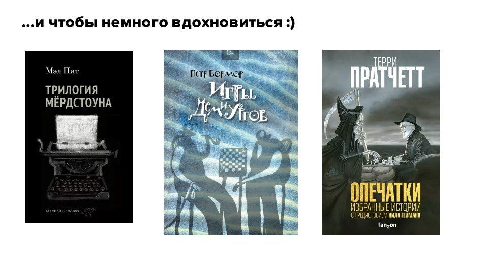 Всем, кто хочет попробовать себя в написании фэнтези, советую прочитать «Пособие для начинающих авторов фэнтези» Сапковского, «Книгу чудес» Вандермеера, «Причеши меня. Твой текст» Звонцовой, «Опечатки. Избранные истории с предисловием Нила Геймана» Пратчетта.