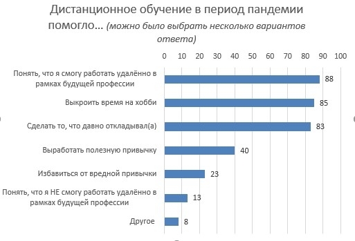 В дистанционном формате студентам удалось сделать то, что давно откладывалось (83 ответа), выкроить время на хобби (85 ответов) и понять, что работать по специальности удалённо они смогут (88 ответов). Отметим, что противоположный ответ («Не смогу работать удалённо в рамках будущей профессии») выбрали всего 13 человек.