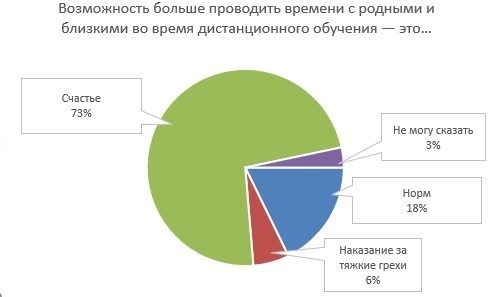 Почти три четверти опрошенных (73 %) были счастливы вернуться домой и проводить больше времени с родными и близкими. Не испытали особых чувств по этому поводу 21 % респондентов, недовольными оказались 6 % участников анкетирования.