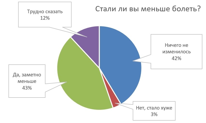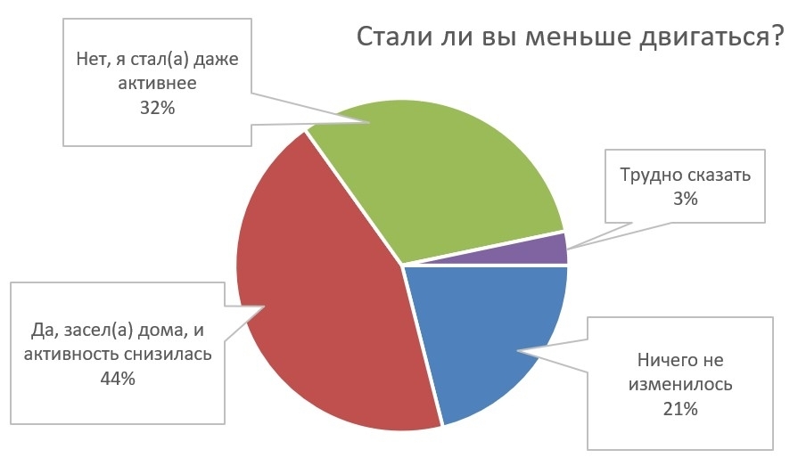 Почти половина респондентов (44 %) выбрала ответ «Да, засел (а) дома, и активность снизилась». Тем не менее, каждый третий респондент (32 %) нашёл мотивацию к повышению активности.