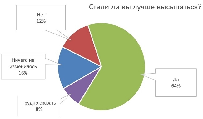 Большинство респондентов (64 %) выбрали ответ «Да», каждый восьмой (12 %) — «Нет». В первом случае ключевым фактором, по всей видимости, стала экономия 2-3 утренних часов, затрачиваемых в очном формате на сборы и дорогу до вуза, во втором — сбитый по этой же причине режим. Не заметили изменений либо не смогли ответить 24 % участников опроса.
