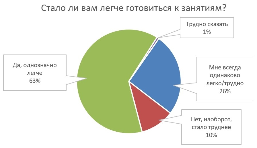 Больше половины респондентов (63 %) согласились, что в дистанционном формате им было легче готовиться к занятиям, каждый десятый (10 %) — что труднее, четверть респондентов (27 %) не заметили изменений. В интервью студенты часто отмечали наличие домашнего компьютера, заметно облегчающего подготовку к семинарам и конспектирование лекций.
