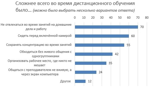 Сохранять концентрацию, сидеть перед включённой камерой и не отвлекаться на домашние дела (и работу!) — первая тройка сложностей, с которыми пришлось справляться во время «домашнего» обучения (55, 60 и 70 ответов соответственно). В свободных ответах респонденты чаще всего указывали на проблемы с техническим обеспечением (три ответа).