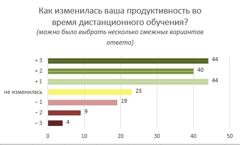 Самый удивительный (по крайней мере, для преподавателей) результат исследования: уверенность большинства студентов в том, что на дистанционном обучении их продуктивность повысилась (70 % ответов). В критическом снижении продуктивности («—3») признались лишь 4 респондента, о максимальном росте («+3») сообщили 44.