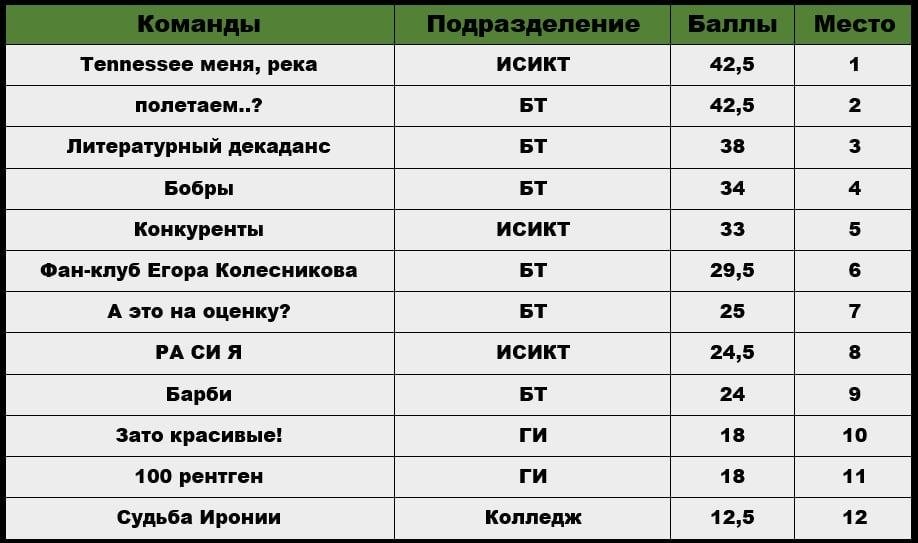 Квиз это одно из моих самых любимых мероприятий вуза. Его долго не было, поэтому, зарегистрировался без раздумий, как только увидел анонс. Квиз получился суперинтересным, вопросы были не сложные, но иногда приходилось доставать ответы из закромов памяти. Когда после 6 раунда я посмо трел на таблицу и увидел, что мы на 1 месте, я почувствовал огромный прилив адреналина и азарта и понял, что нужно забирать этот квиз. Всю игру мы шли впритирку с командой «Литературный декаданс», но даже не осознавали, что помимо них в спину нам дышал ИСИКТ. В итоге у нас 2 место. Обидно. Но квиз хороший.