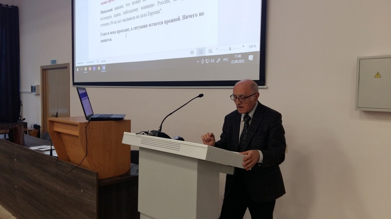 Василий Иванович Кирмикчи продолжил интереснейший рассказ коллеги представлением биографий военачальников, сыгравших значительную роль в Отечественной войне 1812 года. Он, в частности, вспомнил историю семьи и вехи военной карьеры Багратиона, Барклая де Толли, Михаила Кутузова. Повествование сопровождалось показом слайдов. Студенты увидели портреты генералов, военную форму того времени, узнали о воинских званиях личного состава русской армии. Лектор перечислил восемь стран Европы, которые принимали непосредственное участие в войне против России. «Годы и века проходят, но ничего не меняется со стороны европейских стран по отношению к нашей стране», — не без горести подметил он.