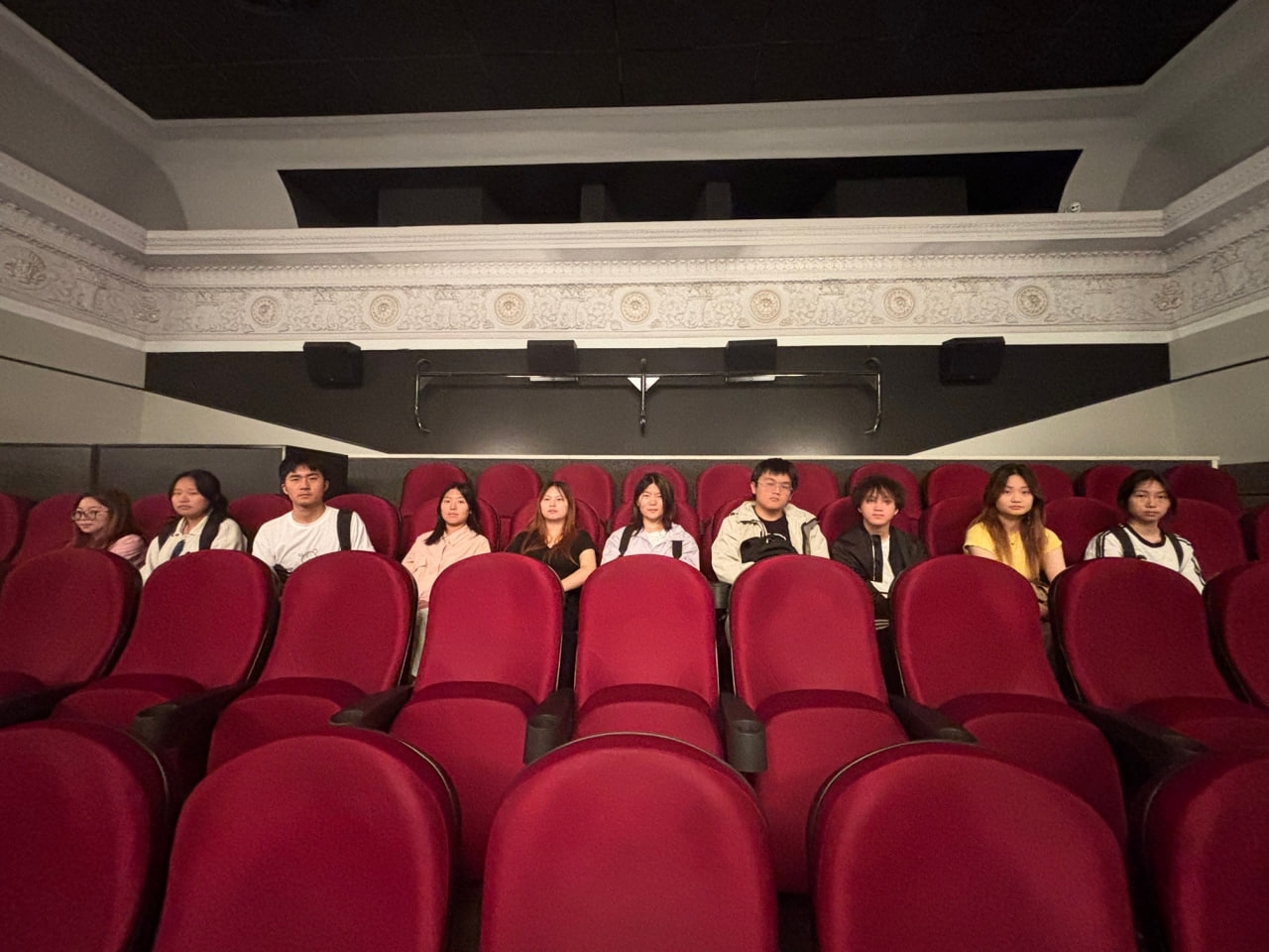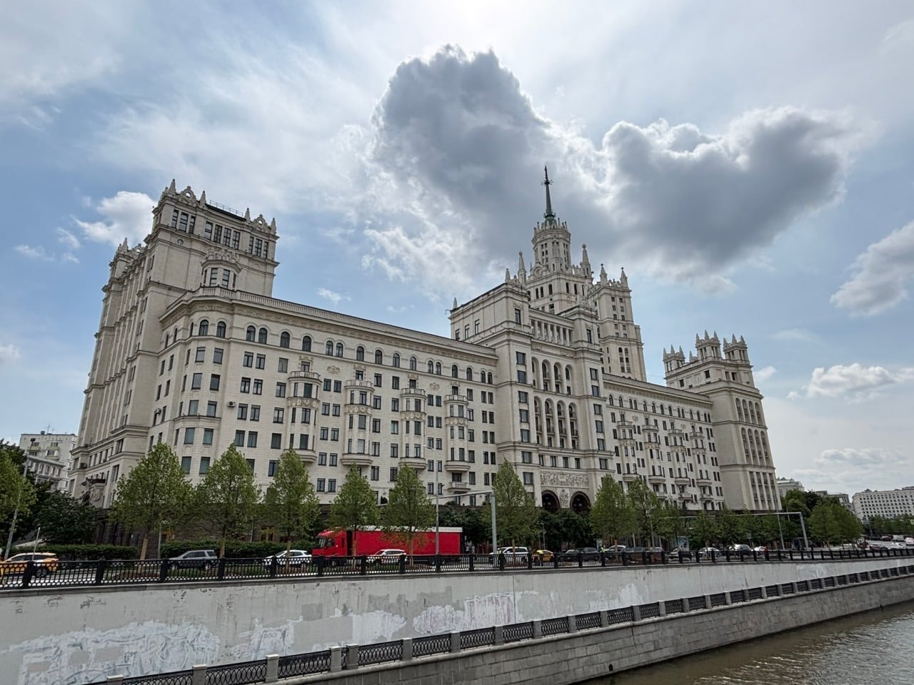 Перед сеансом ребята прогулялись вокруг сталинского небоскреба на Котельнической, мы вместе почитали мемориальные доски с жителями высотки, зашли во двор, вышли на берег реки Яузы, откуда открывается вид на Кремль. Я рассказала студентам о строительстве высотки, её истории, а также о сталинском ампире, продемонстрировав интерьеры кинотеатра.
