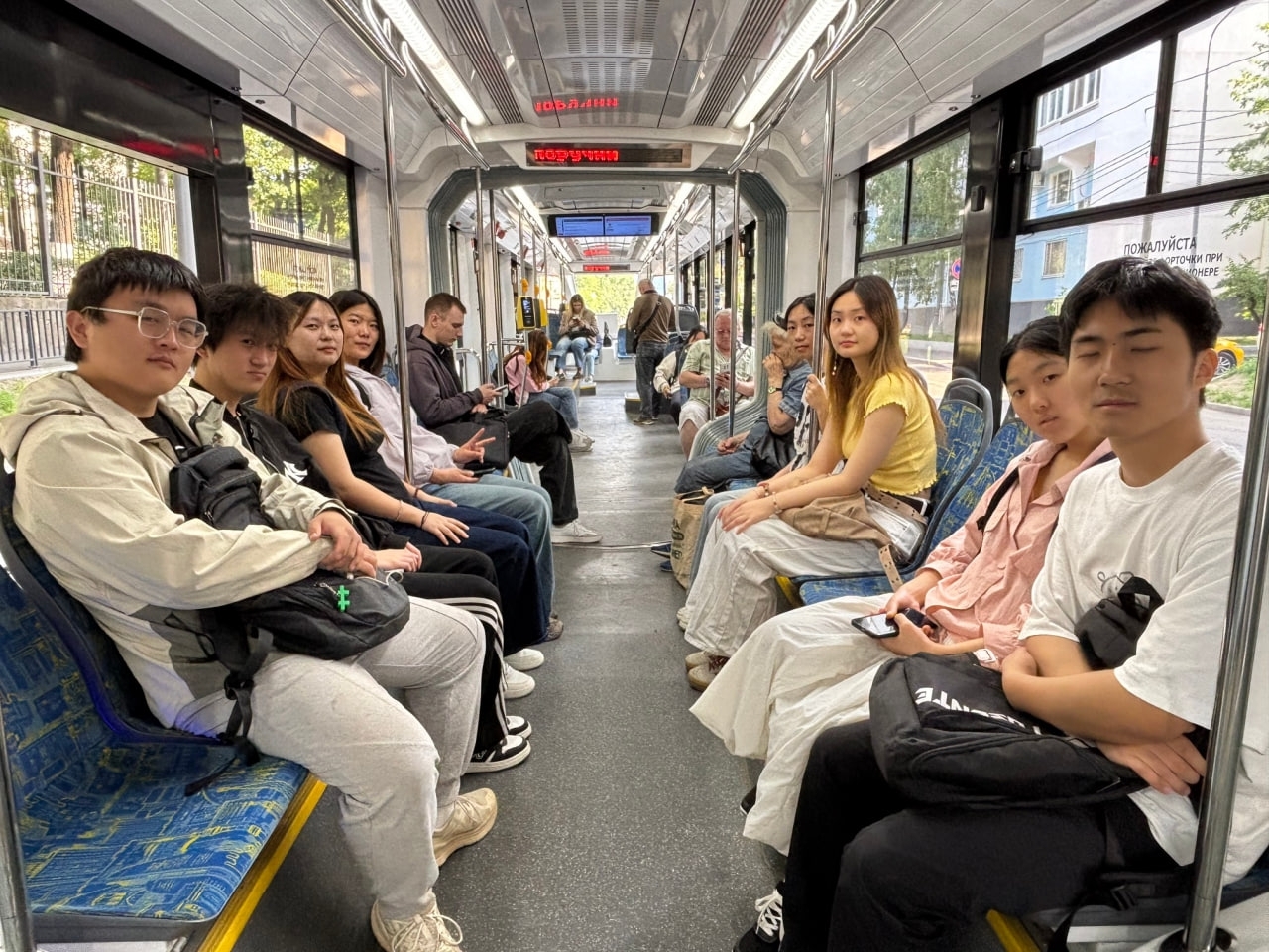 По пути в кинотеатр студенты практиковали коммуникативные навыки в реальных ситуациях. В трамвае было необходимо попросить незнакомца передать проездную карту для отметки валидатором и спросить, какая остановка следующая, узнать у водителя маршрут движения транспорта, выяснить, как пройти от остановки трамвая № 4 до автобуса М6 при пересадке.