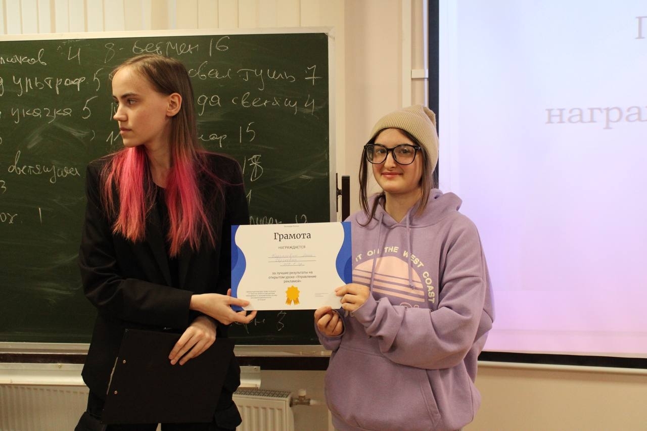 Открытый урок по профессиональному модулю «Менеджмент и экономические основы рекламной деятельности» подготовили старшекурсники под руководством преподавателя профессиональных дисциплин Ольги Владимировны Ткачук. Занятие на тему «Управление рекламой» включило в себя доклады с познавательными фактами и интерактив для гостей, в ходе которого ребята с первого курса блеснули креативностью в мозговом штурме в рамках темы урока. За лучшие предложения участники получили награды.