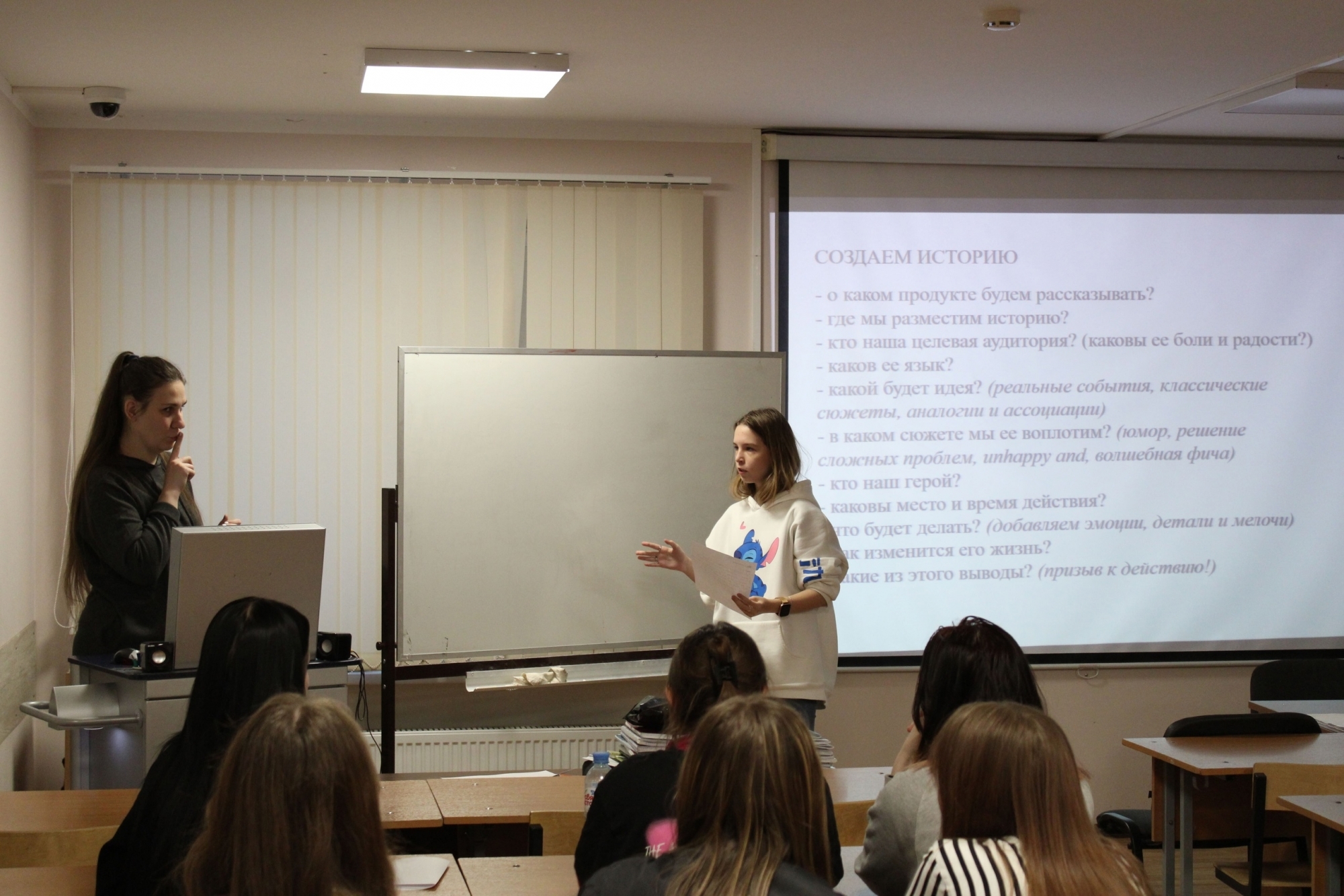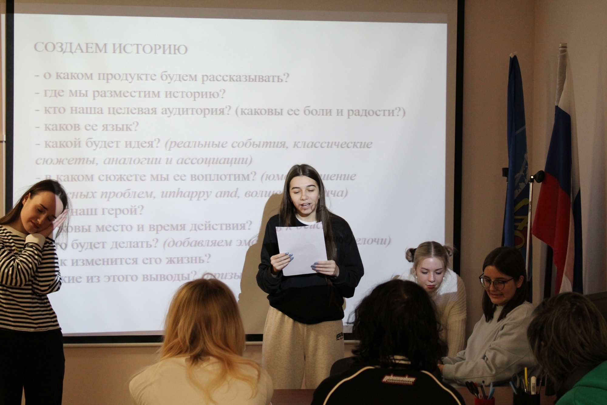 Два открытых урока по дисциплине «Основы журналистики» от Марины Александровны Федуловой завершили Неделю рекламы в колледже. На встречах «Сторителлинг в профессиональной деятельности» Марина Александровна рассказала, как превратить сочинение в историю, которая донесёт до аудитории идею и ценность продукта (бренда). Затем участники попробовали себя в данном жанре: вытягивали предмет и писали историю о нём в одном из предложенных стилей (статья, сценарий и пр.). Преподаватель и зрители отметили высокий уровень креативности у ребят, что важно для выбранной ими профессии.
