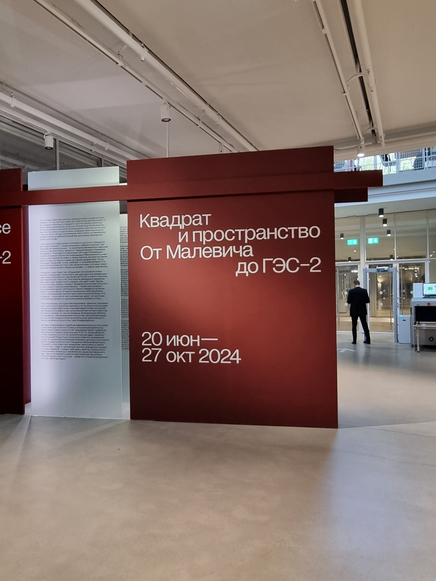 Экскурсия состоялась в формате медиаторского тура — беседы с экскурсоводом дома культуры о взаимоотношениях искусства, публичного пространства и зрителя. Одна из целей выставки — показать, как «Квадрат» Казимира Малевича повлиял на развитие искусства, как изменились форматы: от академического музея до современного выставочного пространства, представленного в ГЭС-2.