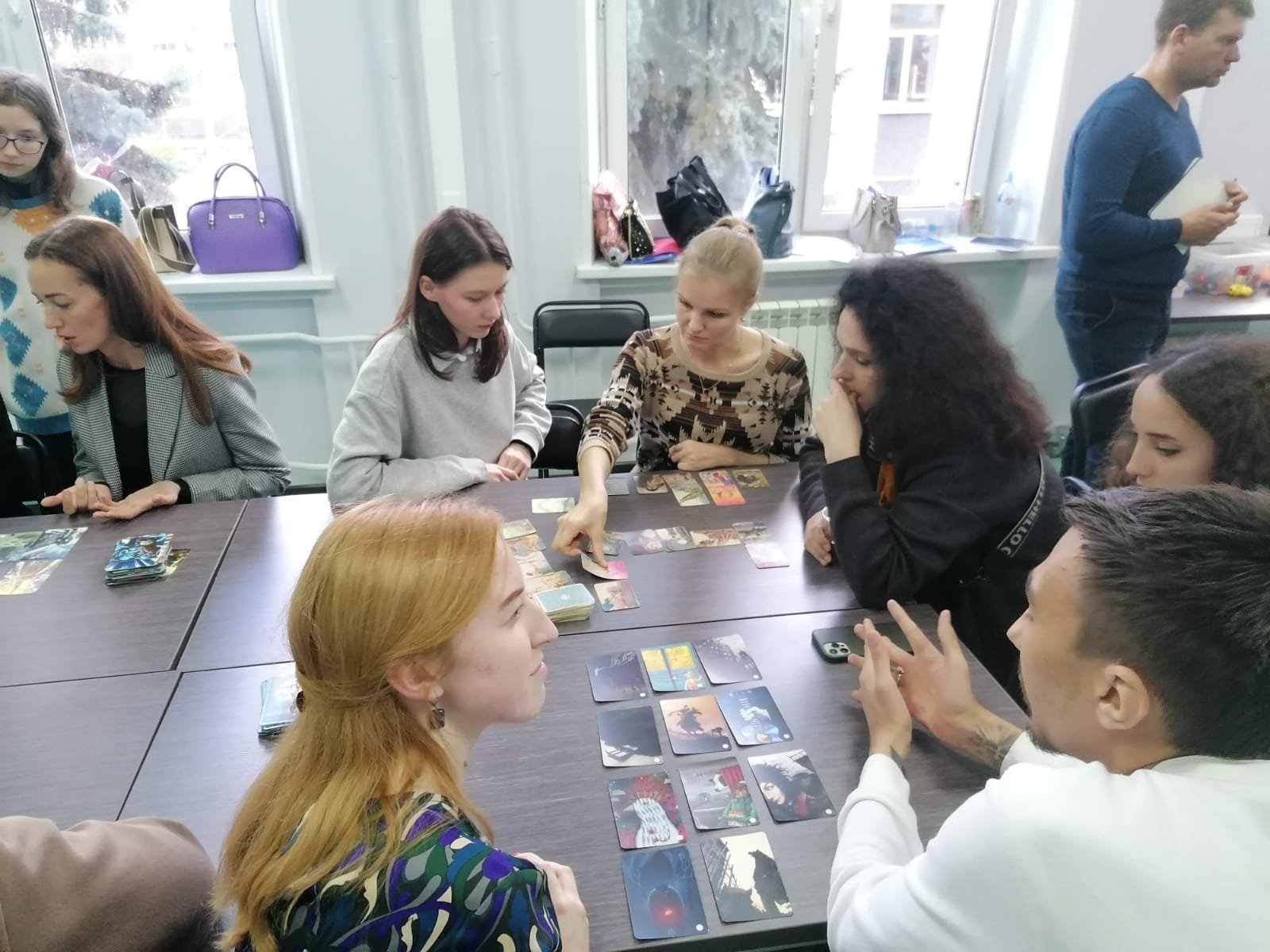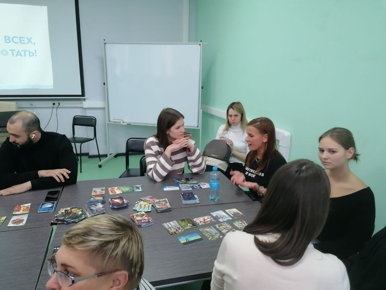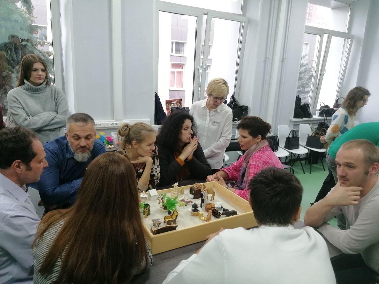 Тренинг состоял из трех этапов. За одним столом с помощью песочного моделирования специалисты описывали свой продукт — курсы для будущих соискателей. Необходимо было подчеркнуть преимущества, сильные стороны и возможности, которые открываются им благодаря прохождению курсов. За другим — с помощью метафорических карт выстраивали структуру беседы с будущими соискателями, за следующим — прорабатывали свое состояние при взаимодействии с ними (волнение, вдохновение, радость), используя кинетический песок.