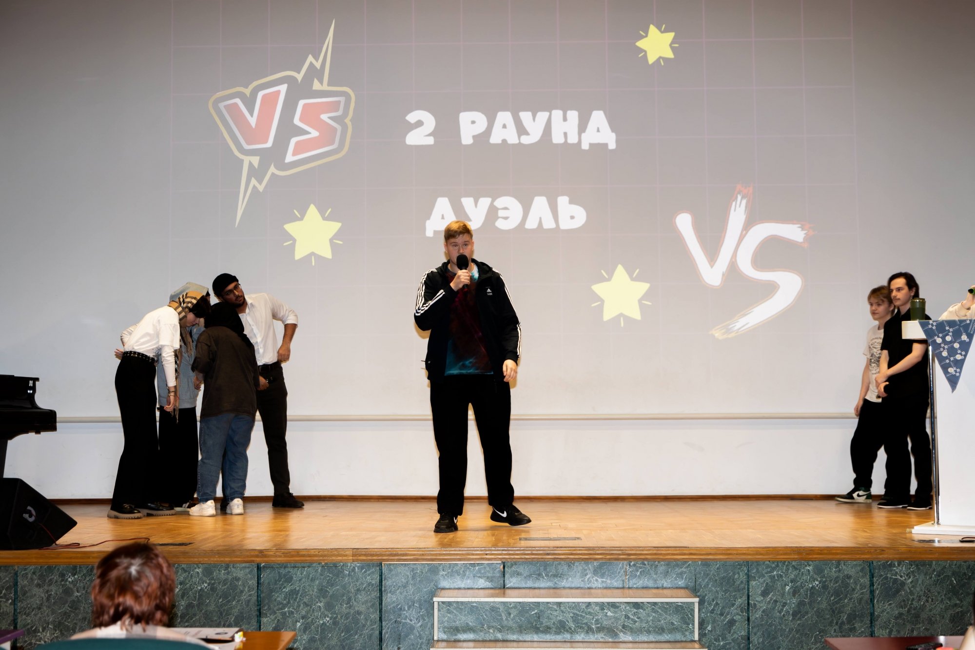 Второй раунд — «Дуэль» — прошёл в поединках команда на команду. Одна команда давала начало фразы, другая — конец. Например: «Балерина в уютном кафе читает рэп». На получившуюся тему должны были пошутить обе команды.