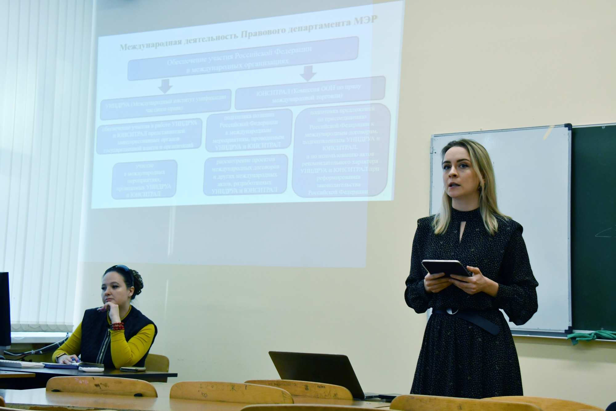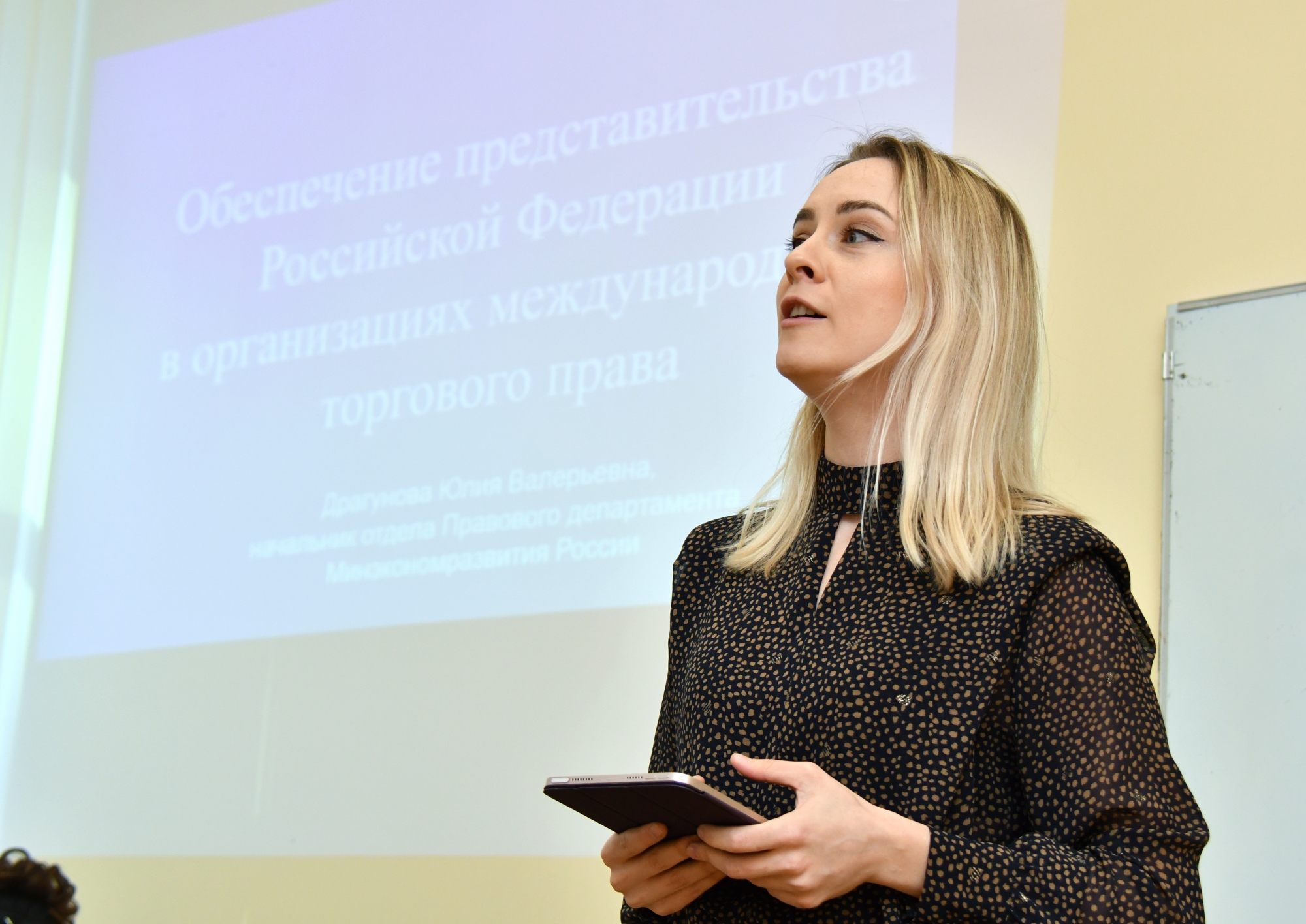 Выступление было посвящено особенностям участия Российской Федерации в работе органов по вопросам торговли системы ООН, а также иных международных торговых организациях.