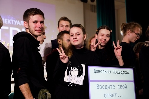 Второй раунд играли команды новичков. Первокурсники сразу порадовали. Названия команд вызвали бурные аплодисменты зрителей — а их в зале было очень много, интеллектуальные игры всегда вызывают огромный интерес. Команда Института экономики, управления и финансов логично выступала под ником «Плати налоги», одна команда Института информационных систем и инженерно-компьютерных технологий подчеркнула свою молодость и крутизну версией «The OrangeAge», другая — выбрала название «Грибы», первокурсники-рекламисты из Института бизнес-технологий решили назвать себя «Бобры», а команда колледжа — «Маленькие активчики».