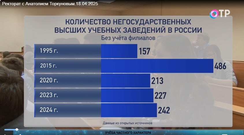 Ведущий программы, ректор МГИМО Анатолий Торкунов отметил тенденцию роста количества частных высших учебных заведений и спросил гостей, с какими объективными причинами это связано. Приводим фрагмент беседы.