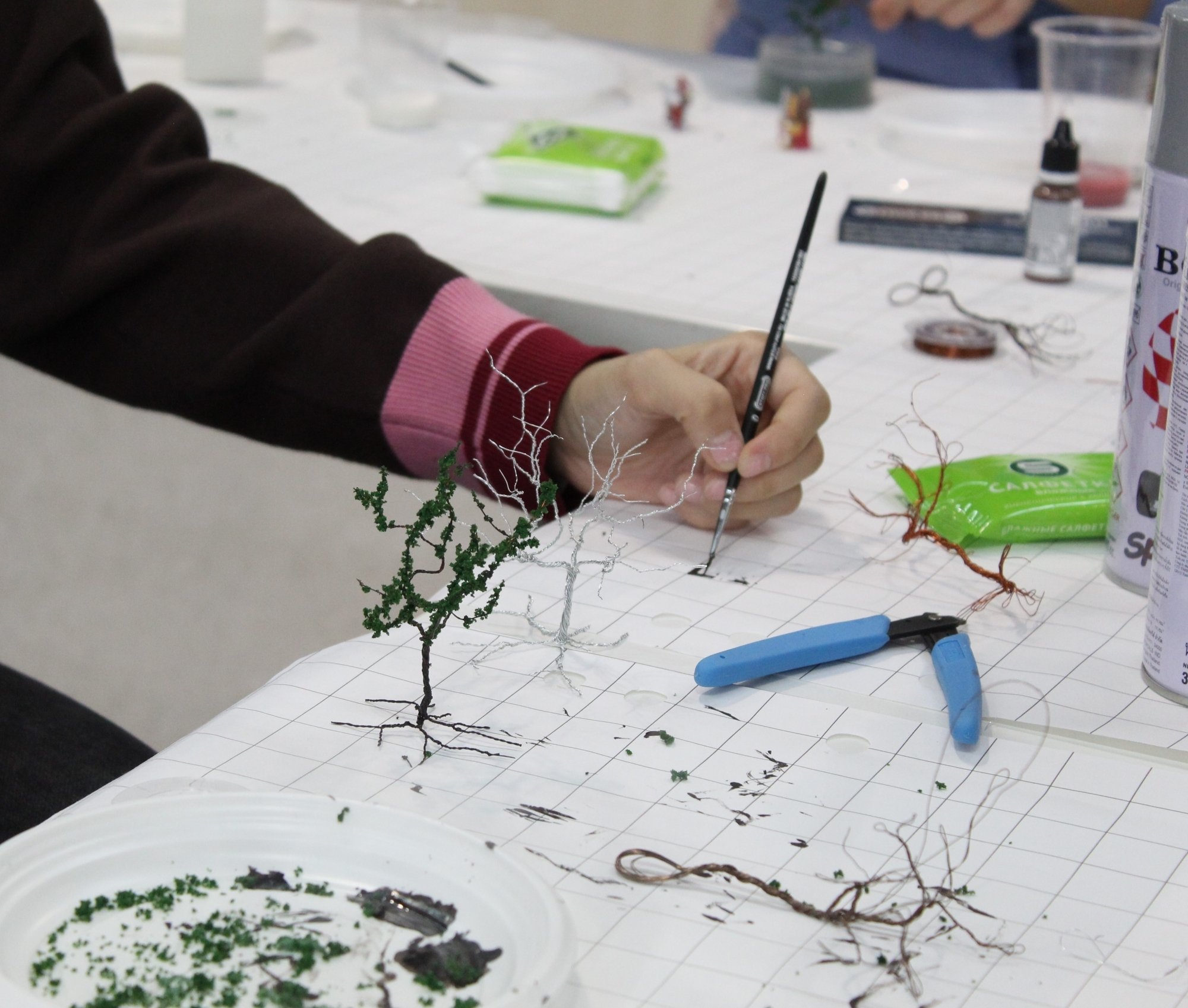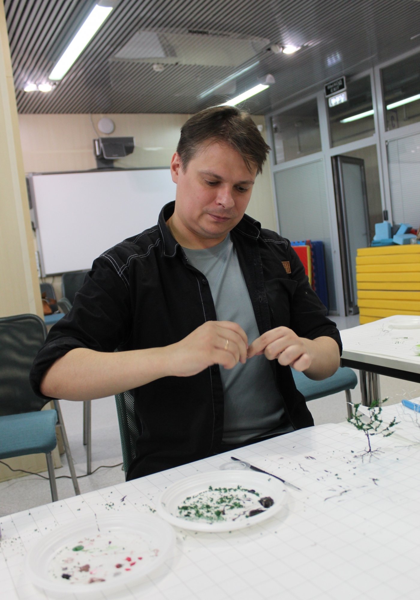 В зоне для проведения совещаний, лекций, тренингов и мастер-классов организаторы оборудовали импровизированную мастерскую, в которой участники учились создавать миниатюрные модели деревьев и раскрашивать фигурки для настольных игр. Все необходимые материалы предоставили организаторы — от кистей и красок до кусочков мха и клея.