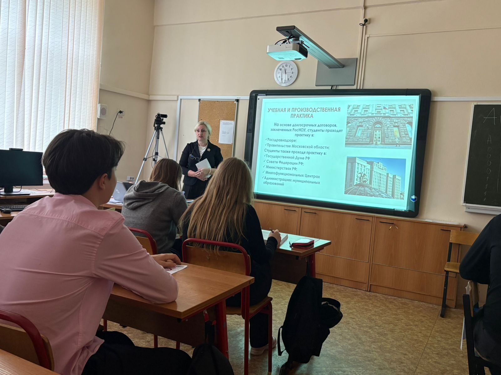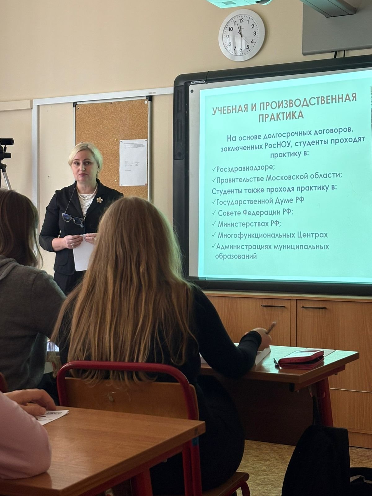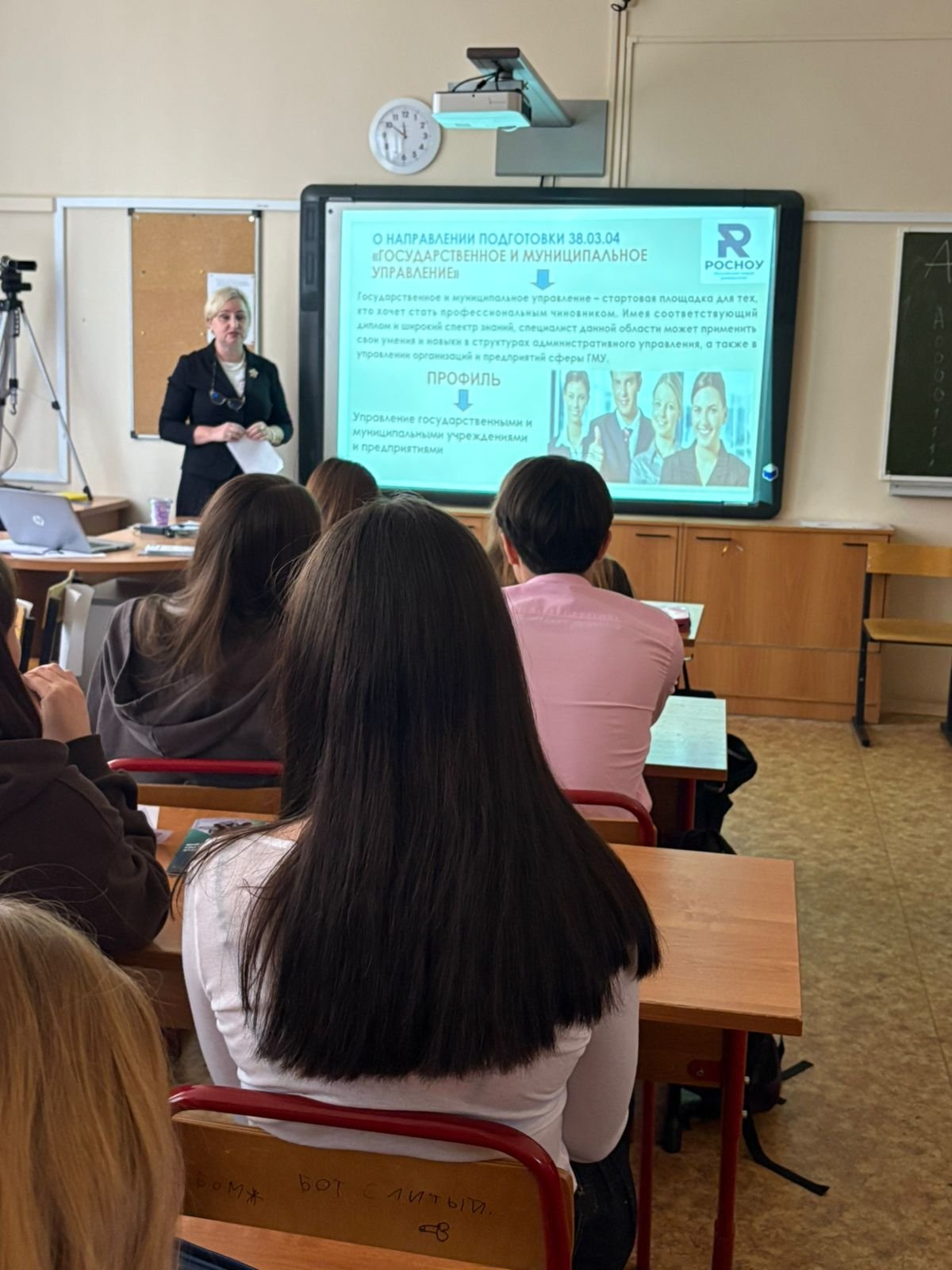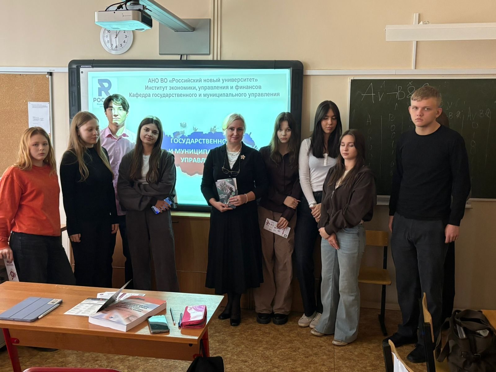 6 ноября 2025 года Российский новый университет провёл профориентационное мероприятие для учащихся 11 классов школы № 1228 района Лефортово. Доцент кафедры государственного и муниципального управления Института экономики, управления и финансов РосНОУ, кандидат экономических наук Ирина Анатольевна Кубрак рассказала учащимся о направлении подготовки ИЭУиФ «Государственное и муниципальное управление», а также о студенческой жизни университета.