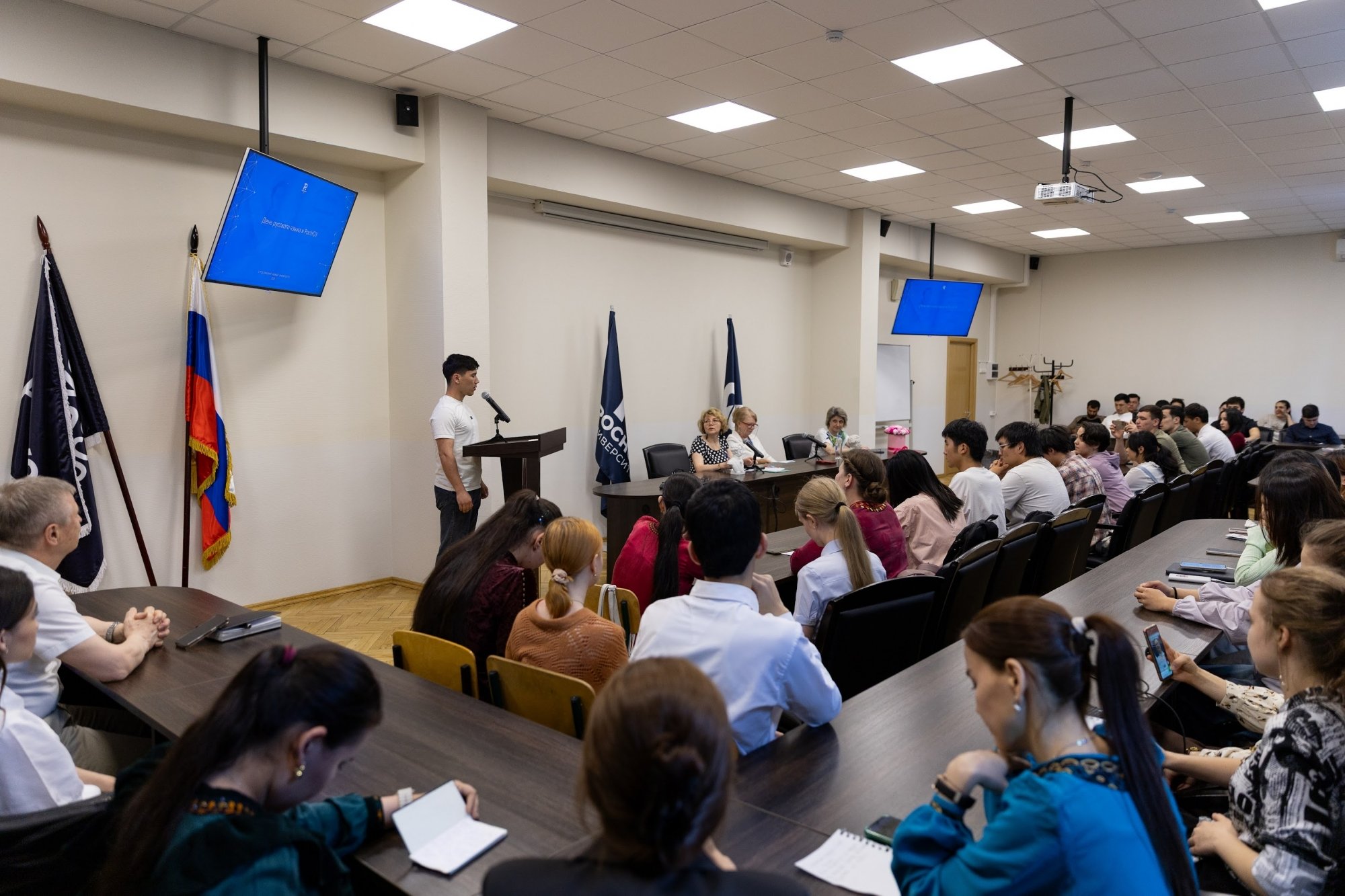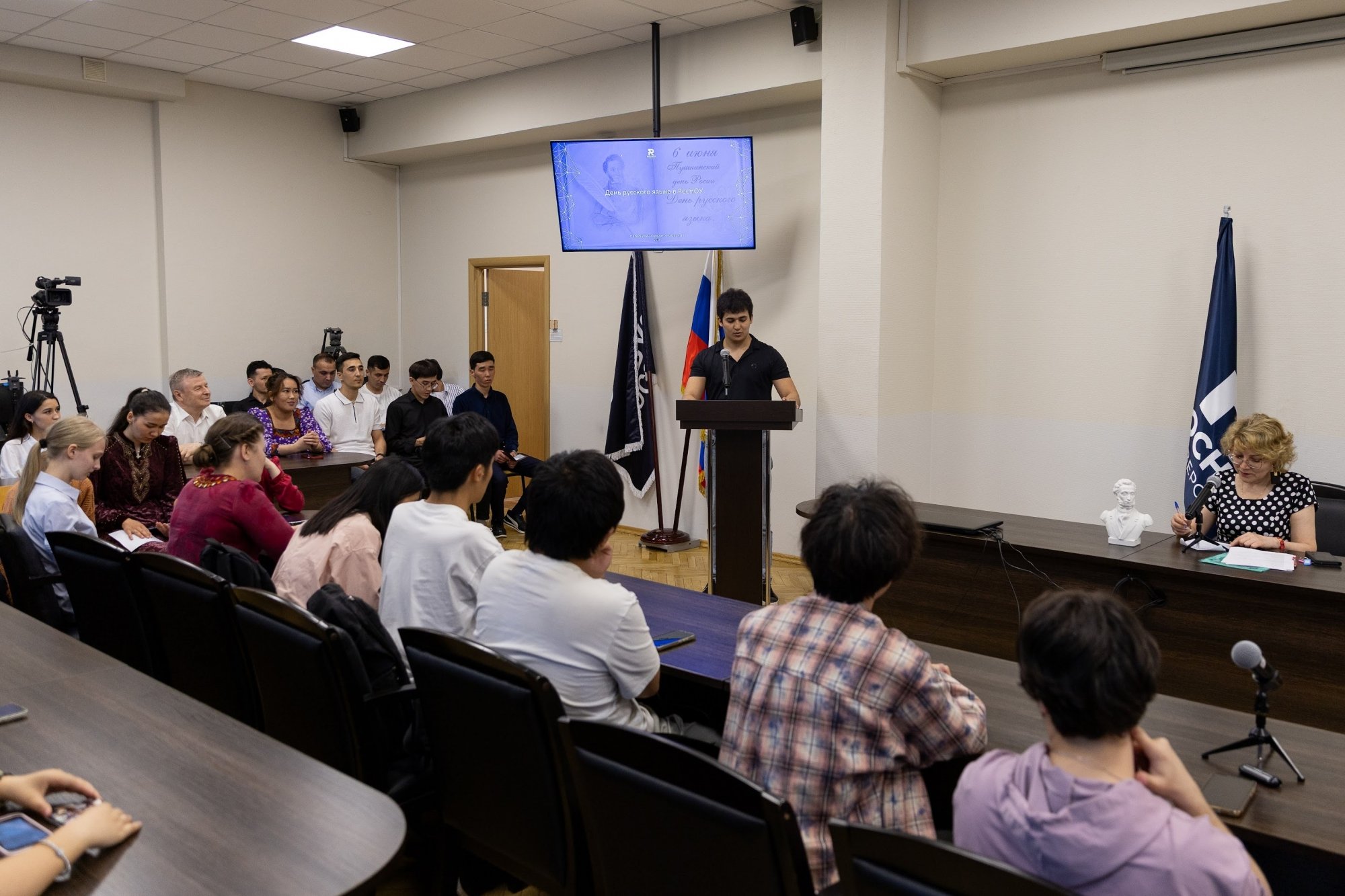 Мы всегда отмечаем День русского языка, это наша традиция. Раньше устраивали заседания Зелёной лампы, однако в этот раз желающих прийти оказалось так много, что мы с Ириной Валерьевной решили изменить формат и пригласить всех в зал учёного совета для выступления с их любимыми стихотворениями. Все студенты волновались. Несмотря на то, что некоторые китайцы и туркмены уже пробовали свои силы на недавно прошедшем международном конкурсе русской поэзии в Московском доме национальностей, выступать перед «своими» оказалось для них немного сложнее. Но всё получилось: мы услышали их голоса, увидели достижения нашей работы и ощутили общее воодушевление, охватившее зал. Если говорить о выборе произведений, то, конечно, среди иностранных студентов наиболее популярны были вечные темы любви и природы. Лидером стало стихотворение «Я помню чудное мгновенье» (его выбрали шесть студентов!), часто звучали «Я вас любил: любовь ещё, быть может…», «Туча» и стихи на тему осени. Ребята выбирали либо то, что уже слышали раньше, что переведено и изучается в их странах, либо ориентировались на рекомендации своих преподавателей, которые подбирали стихи с учётом их текущего уровня владения языком.