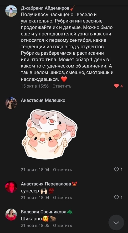 Сейчас я доволен тем, что получается. Наше главное преимущество ― гибкость. Каждый выпуск новый ведущий, а это всегда уникальная подача и атмосфера. Мы можем экспериментировать с рубриками, выбирать новости и форматы, постоянно придумывать что-то. Мы растём, как шоу, и, надеюсь, что скоро и новости, которые мы освещаем, будут все масштабнее. Например, что студент РосНОУ выиграл олимпиаду или получил Оскар.