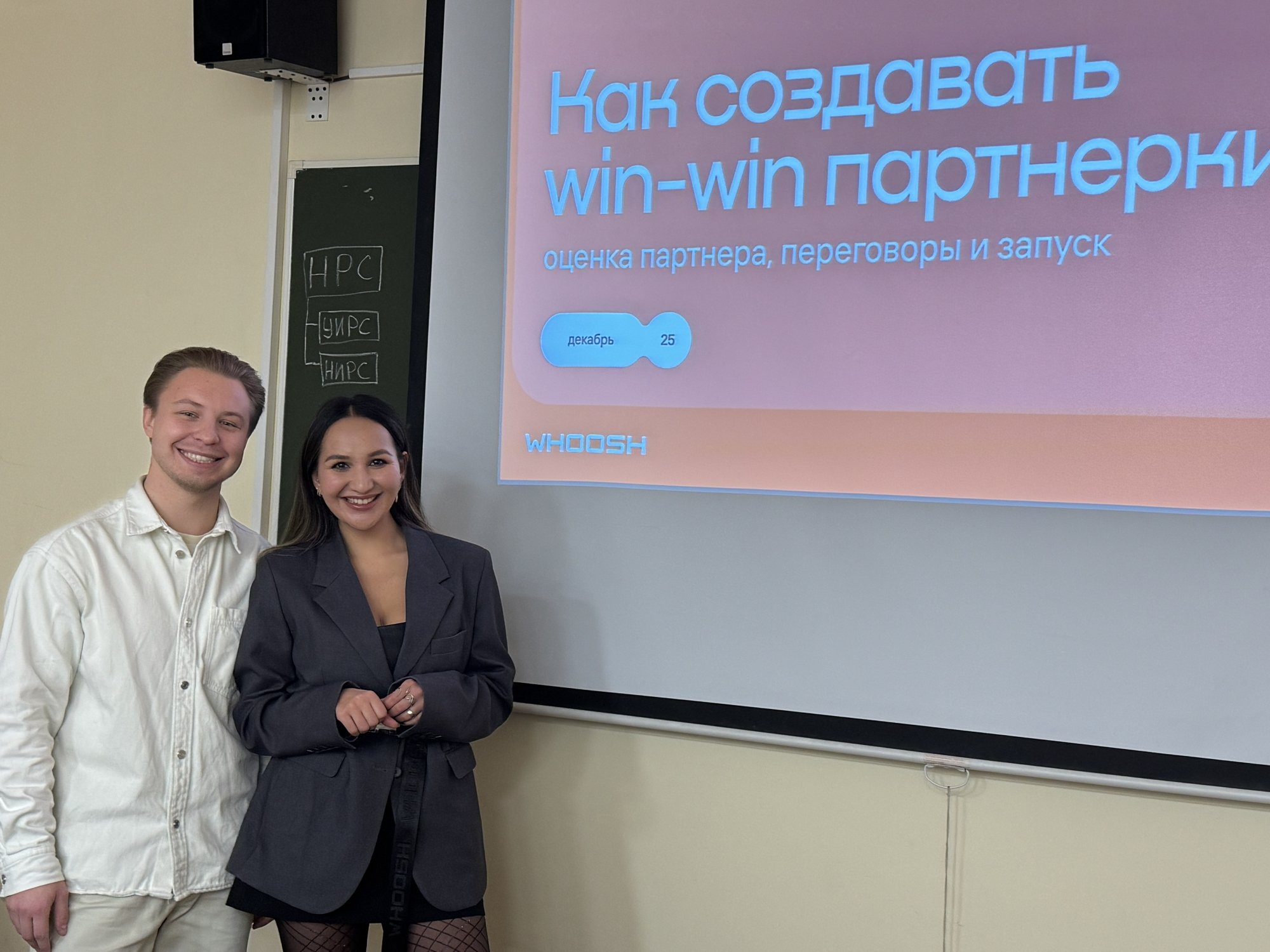 В начале мероприятия студенты узнали о карьерном пути спикера, о важности маркетинга, о нюансах планирования развития, о пиар-стратегиях и о значимости стратегического партнёрства в условиях глобальной конкуренции. На практической части третьекурсники разобрали кейсы и посоревновались друг с другом в разработке креативных идей для возможных совместных мероприятий Whoosh с такими организациями как «Аэрофлот», DDX Fitness, «Золотое яблоко» и Stars Coffee. В конкурсе победила команда, которая придумала и презентовала возможности партнёрства Whoosh с компанией DDX Fitness. Они расписали перспективы и пользу как для обеих компаний, так и для их клиентов и выиграли промокоды на 1000 бесплатных минут для поездки на самокатах фирмы.