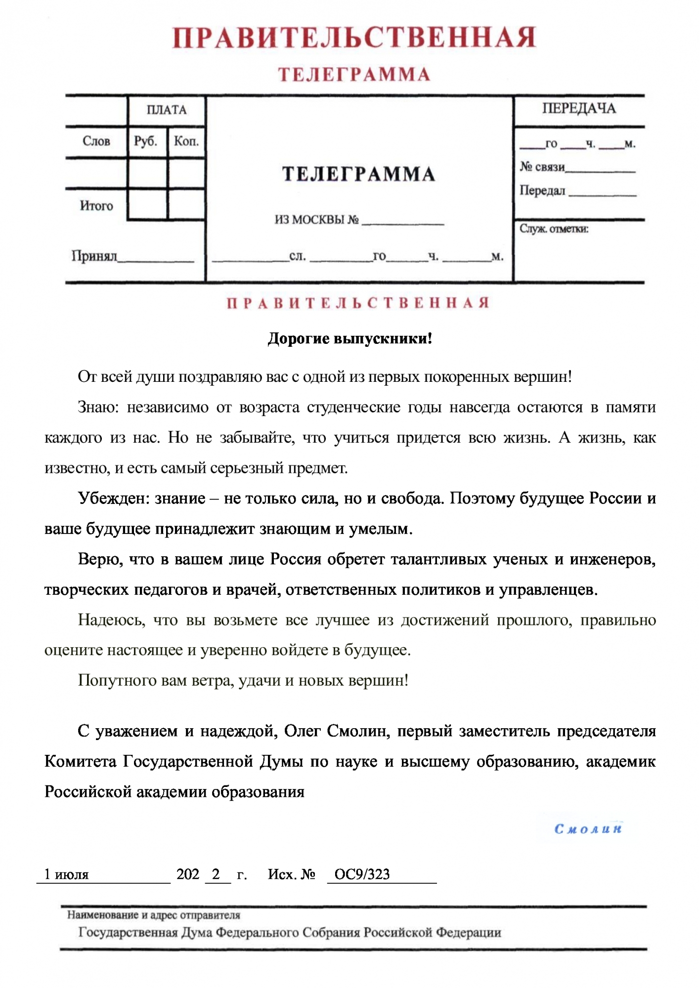 — Дорогие выпускники! От всей души поздравляю вас с одной из первых покорённых вершин! Знаю: независимо от возраста студенческие годы навсегда остаются в памяти каждого из нас. Но не забывайте, что учиться придётся всю жизнь. А жизнь, как известно, и есть самый серьёзный предмет. Убеждён: знание — не только сила, но и свобода. Поэтому будущее России и ваше будущее принадлежит знающим и умелым. Верю, что в вашем лице Россия обретёт талантливых учёных и инженеров, творческих педагогов и врачей, ответственных политиков и управленцев. Надеюсь, что вы возьмете все лучшее из достижений прошлого, правильно оцените настоящее и уверенно войдете в будущее. Попутного вам ветра, удачи и новых вершин! С уважением и надеждой, Олег Смолин, первый заместитель председателя Комитета Государственной Думы по науке и высшему образованию, академик Российской академии образования.