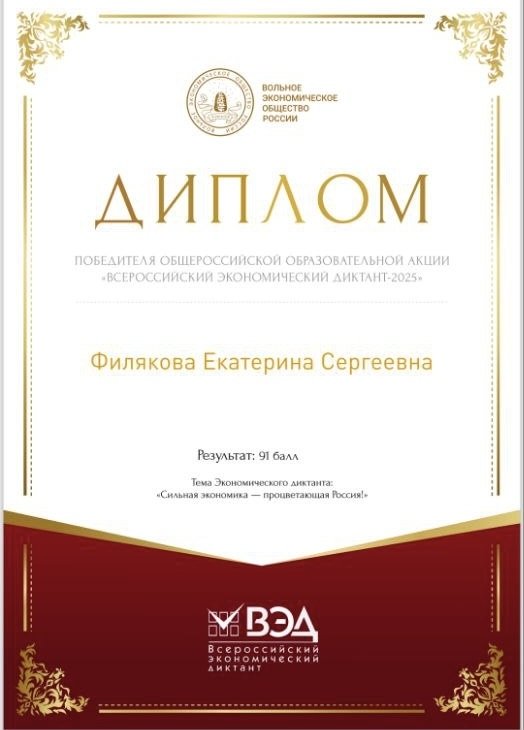 Участники экономического диктанта получили сертификаты с отметкой о набранных баллах. Екатерина Филякова награждена дипломом победителя и приглашена к участию в финале Всероссийского фестиваля экономической науки.