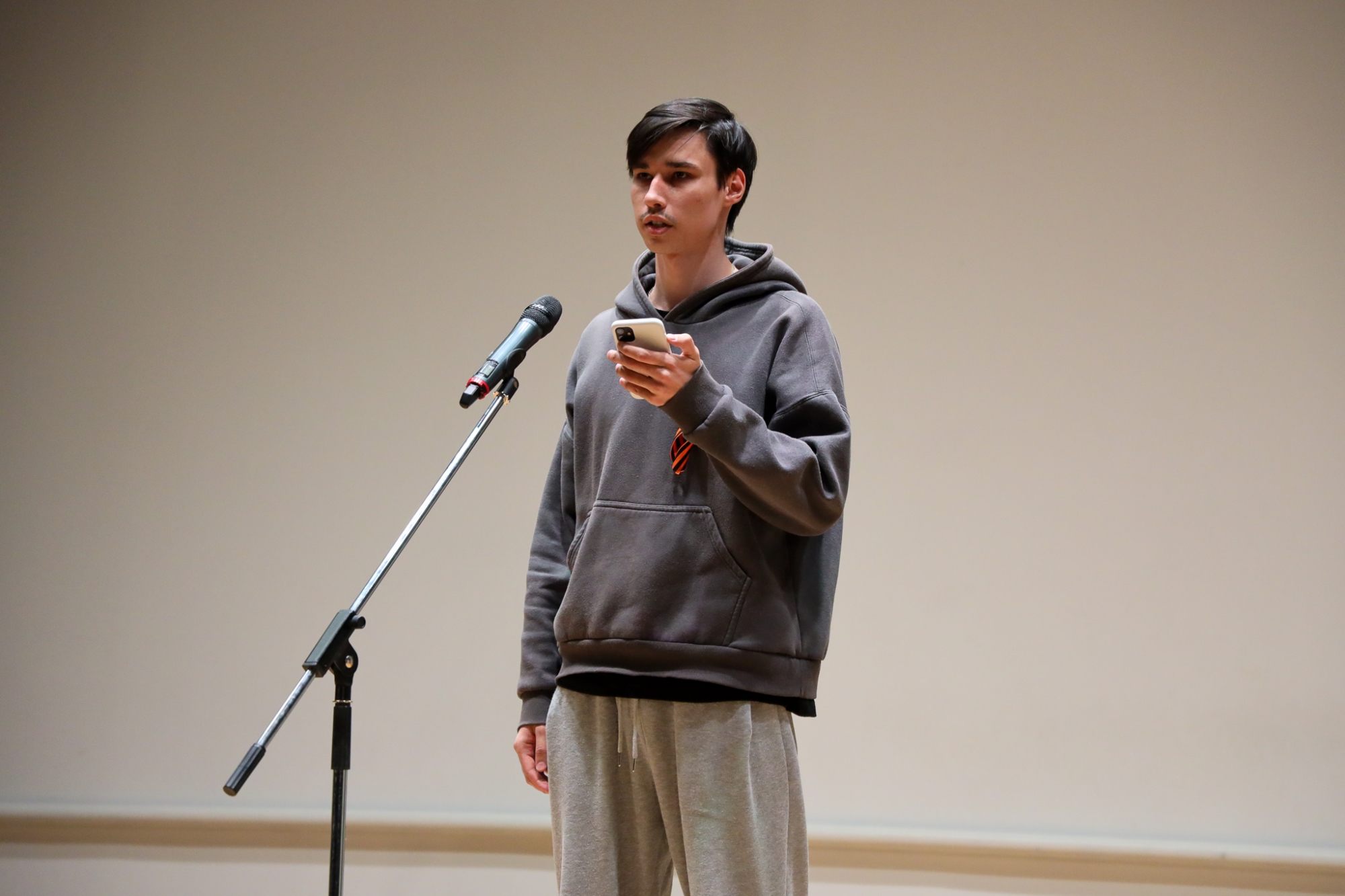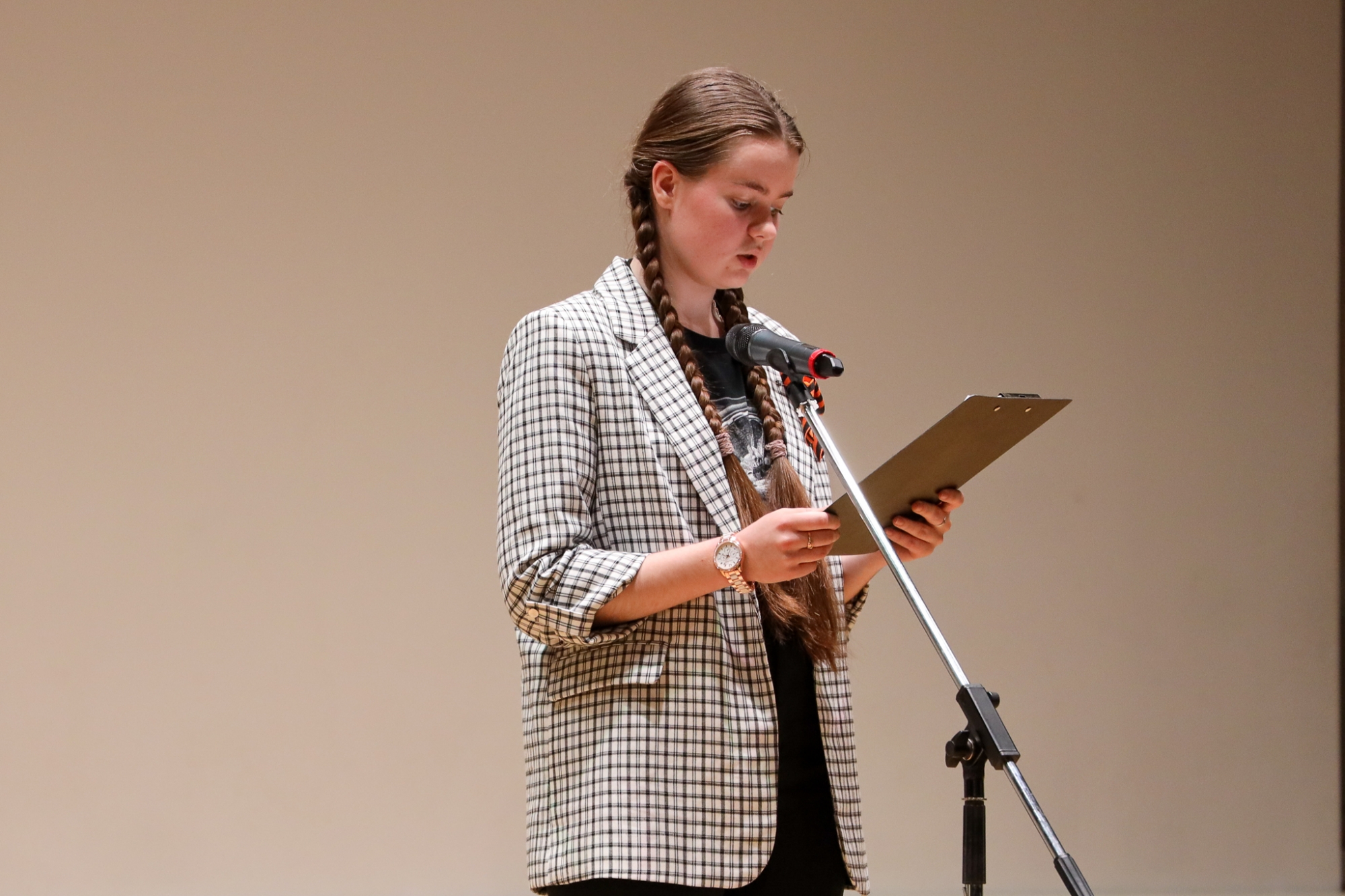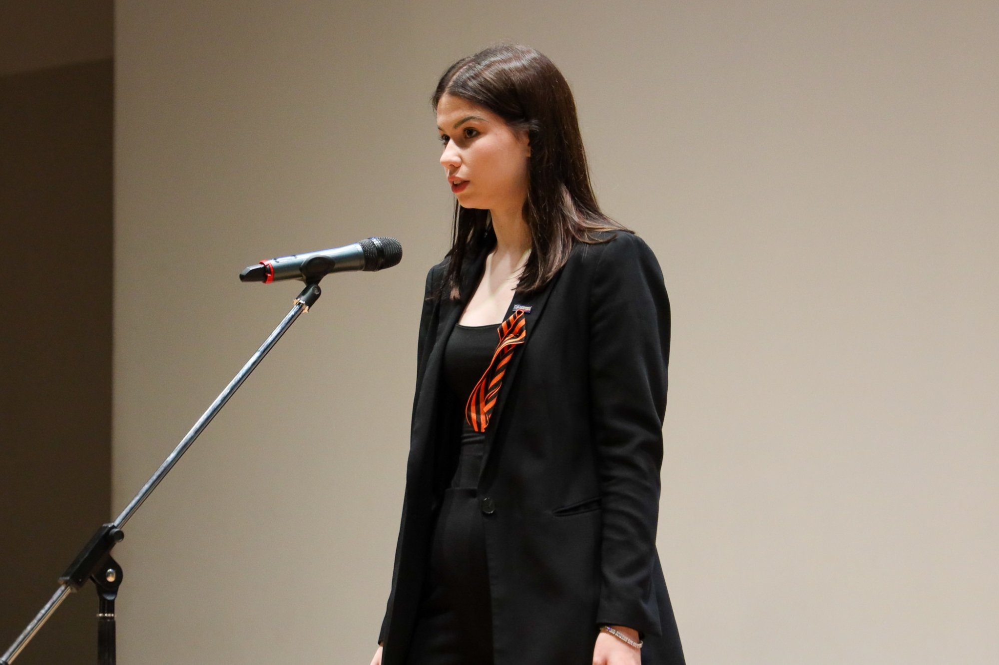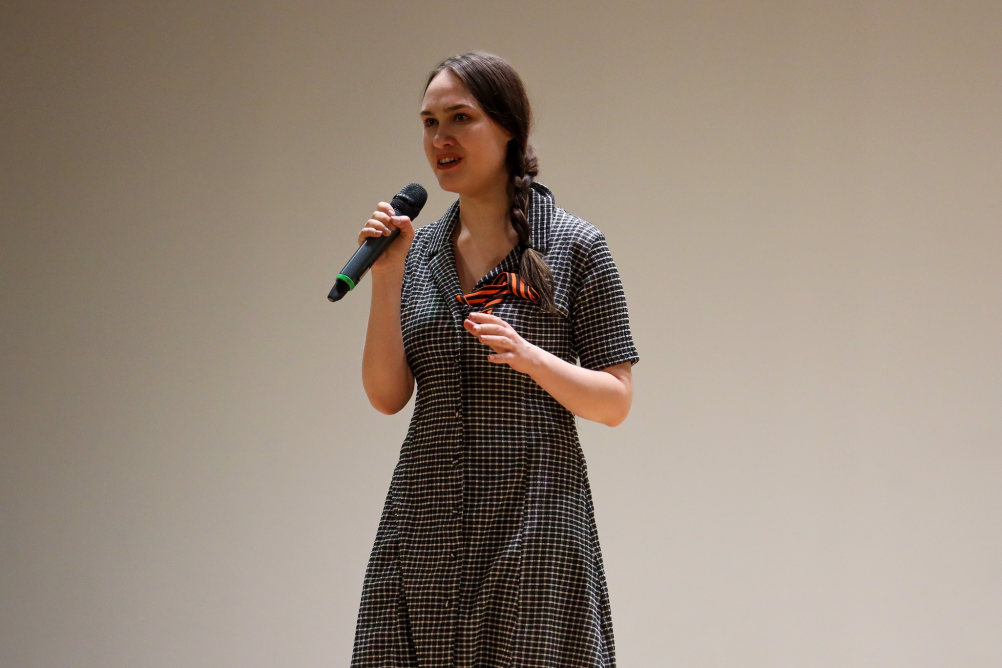 От театральной студии РосНОУ выступила Алёна Шпаковская с отрывком из пьесы Олега Богаева «Марьино Поле». Она прочитала монолог Маши — слова героини произведения брали за душу.
